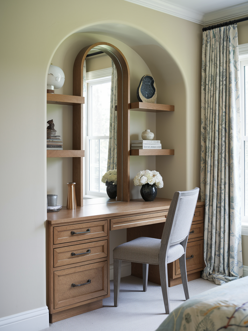 Designing a custom vanity nook in a bedroom corner is a smart way to create a private and elegant beauty area without overwhelming the room. Utilizing an unused corner allows the vanity to feel integrated rather than intrusive. Built-in shelving above the table can display perfumes or decorative accents in a curated manner, maintaining both style and organization. Soft paint colors or subtle wallpaper can define the nook, giving it a distinct identity while preserving overall harmony. Proper lighting and a comfortable chair ensure the space is both functional and inviting. By thoughtfully designing a dedicated corner, you create a sophisticated retreat that feels intimate, organized, and perfectly tailored to your daily beauty rituals.