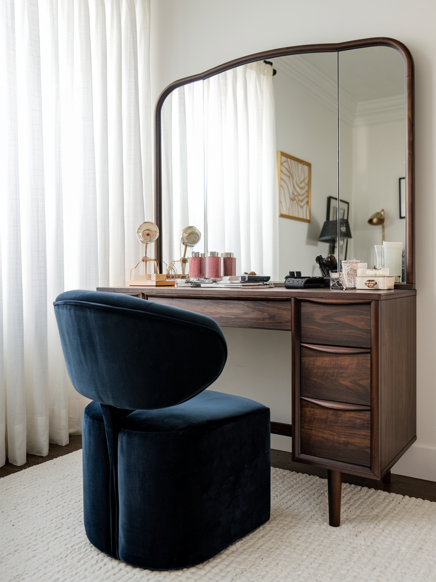 A velvet vanity chair introduces texture, comfort, and refined beauty to your makeup space. The plush fabric adds depth and richness, instantly elevating the overall aesthetic. Neutral shades such as blush, cream, or soft gray create an elegant atmosphere, while deeper jewel tones offer dramatic sophistication. A curved silhouette or subtle tufting enhances the luxurious appeal without overwhelming the space. Gold or slim metal legs add a modern touch, maintaining visual lightness. Beyond style, the soft seating ensures comfort during longer beauty routines. This balance of glamour and practicality makes a velvet chair an essential element in designing a sophisticated and inviting vanity setup.