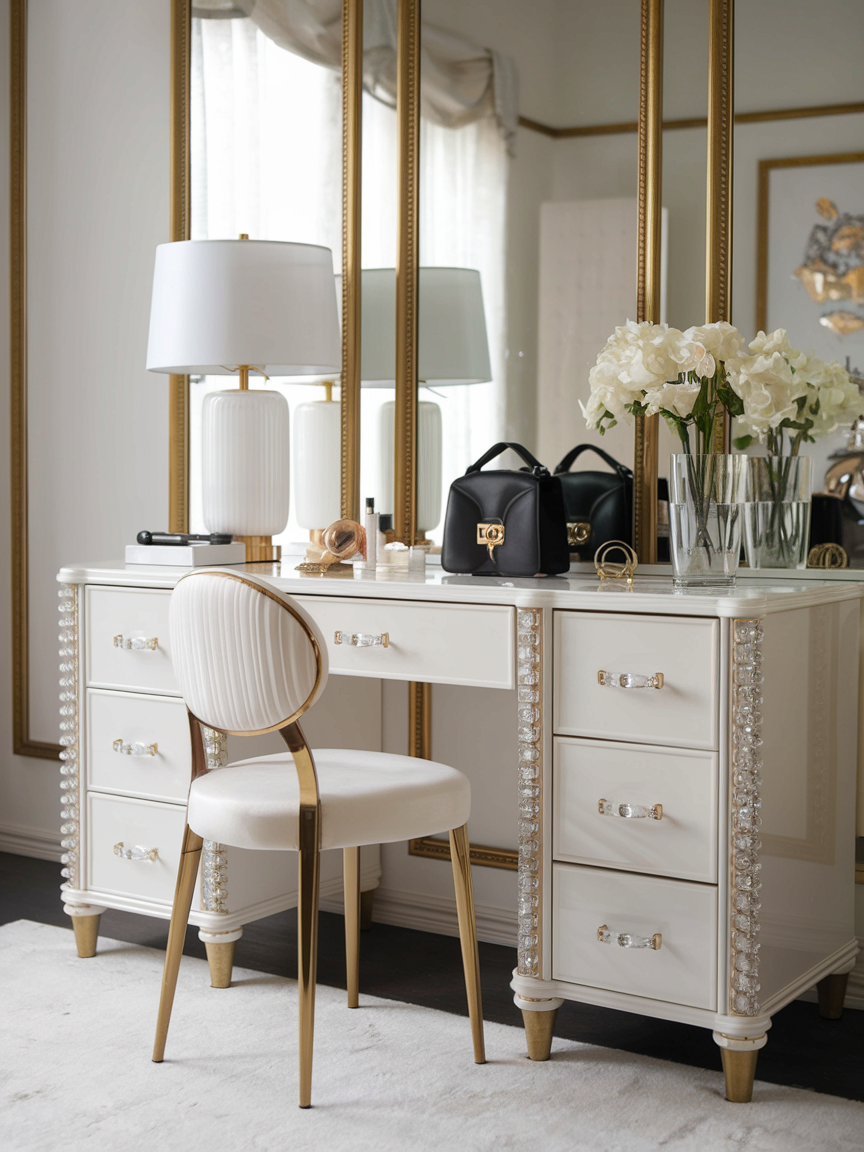 A monochrome glam theme creates a cohesive and striking vanity setup that feels bold yet refined. Selecting a single color palette (such as all-white, blush, or black) and layering it through furniture, décor, and accessories enhances visual harmony. Varying textures within the same tone prevent the design from feeling flat, while metallic accents add dimension. For example, an all-white vanity paired with gold hardware and crystal details creates a luminous, high-end aesthetic. Maintaining consistency in color ensures the space feels curated and intentional. This focused approach highlights elegance through simplicity, resulting in a beauty station that feels polished, luxurious, and effortlessly sophisticated.