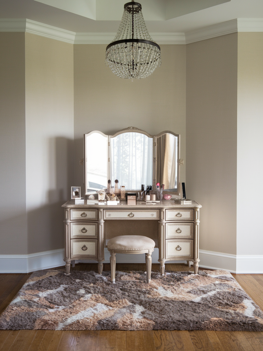 Placing a soft area rug beneath your vanity introduces warmth, texture, and comfort. A plush rug in neutral tones anchors the furniture while softening hard flooring surfaces. Materials such as faux fur, wool, or low-pile woven textiles add subtle luxury without overwhelming the design. The rug also enhances acoustics and creates a cozy atmosphere, making the vanity area feel like a true retreat. Choosing a size that extends slightly beyond the table ensures visual balance and proportion. This simple addition elevates the overall aesthetic, blending comfort with refined elegance. The result is a sophisticated beauty corner that feels inviting, polished, and thoughtfully layered.
