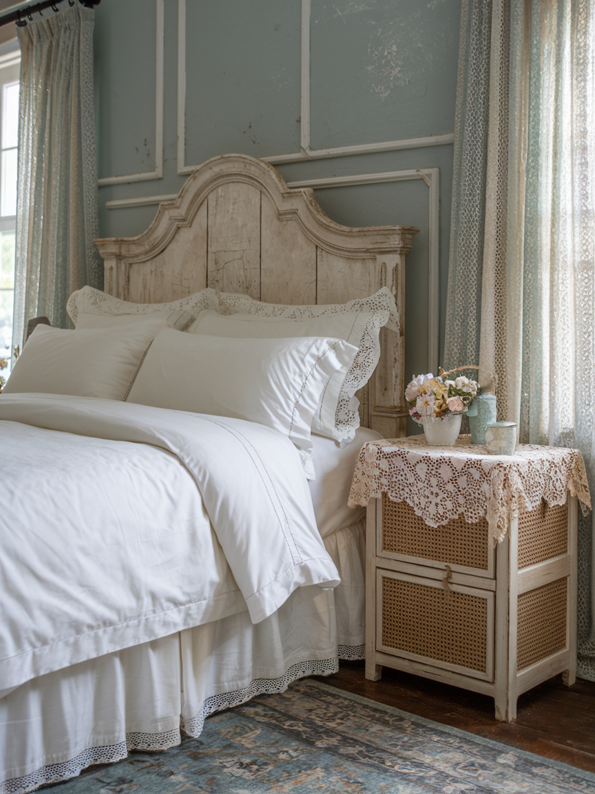 Lace has this magical ability to soften anything it touches. A lace-trimmed pillowcase, a lace doily on a nightstand, or lace curtains instantly elevate your shabby chic bedroom. It doesn’t need to dominate the room—just small touches here and there create that delicate, romantic feel. Lace pairs perfectly with florals and distressed furniture, making it the ultimate shabby chic accessory.