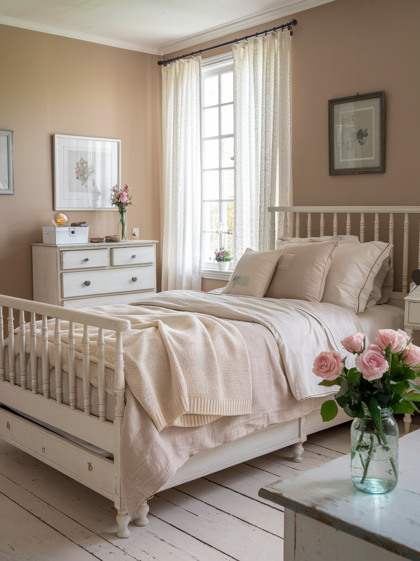Fresh flowers are the cherry on top of a shabby chic bedroom. A simple mason jar with roses, a vase of peonies, or even some baby’s breath adds life and color. Greenery works just as well—ivy or eucalyptus can add a natural, relaxed vibe. Flowers make the space feel alive and cared for, plus they add a subtle fragrance that’s pure magic. It’s a small detail that makes a huge difference.