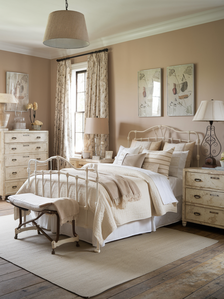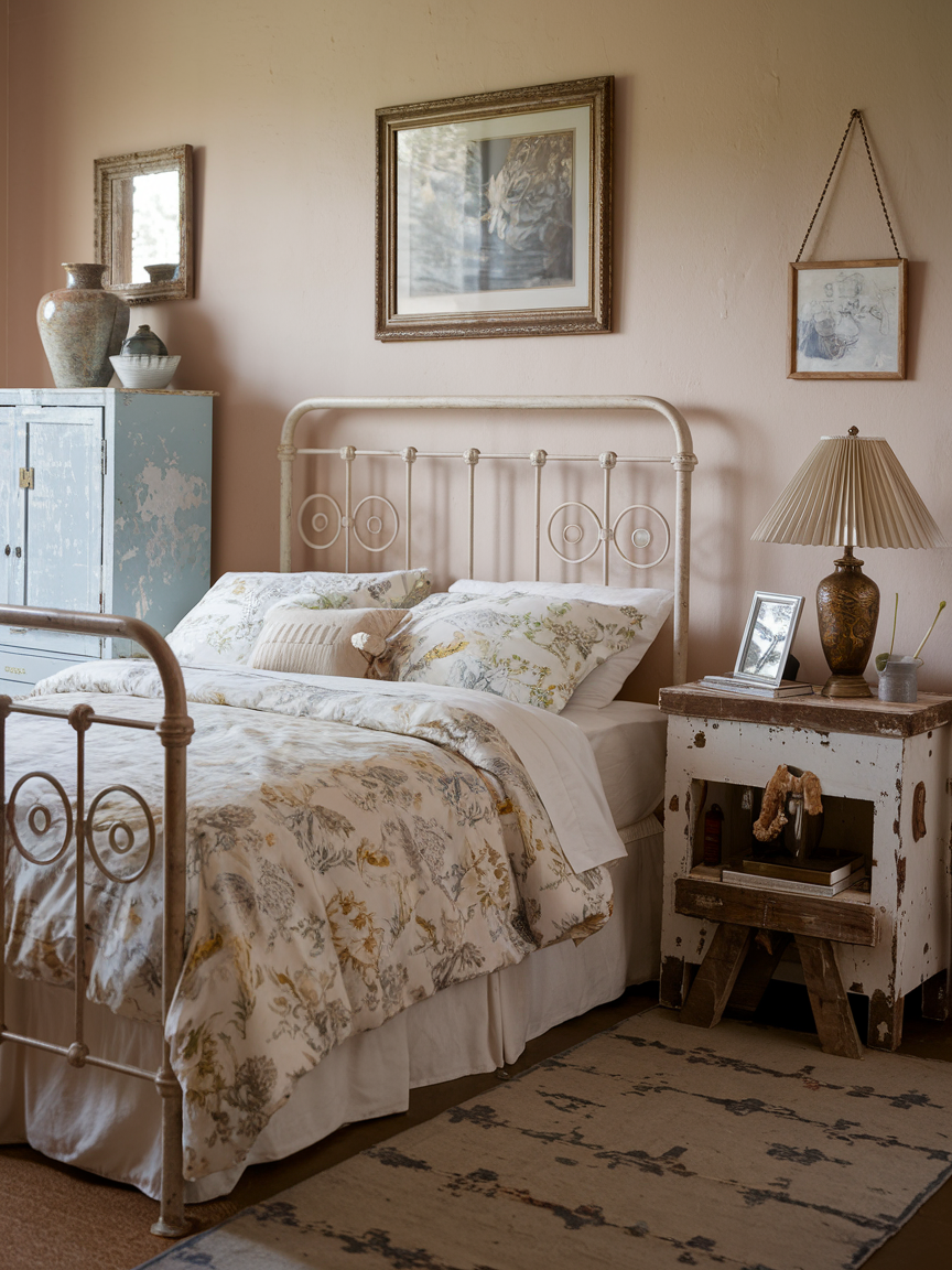 Shabby chic may be soft and romantic, but it also loves contrast. Adding a bit of rustic ironwork keeps things grounded. An ornate iron bed frame, decorative curtain rods, or even a vintage iron candle holder can add just the right amount of strength. It balances all the lace, florals, and pastels so the room doesn’t feel overly delicate. It’s that little edge your bedroom needs to feel complete.