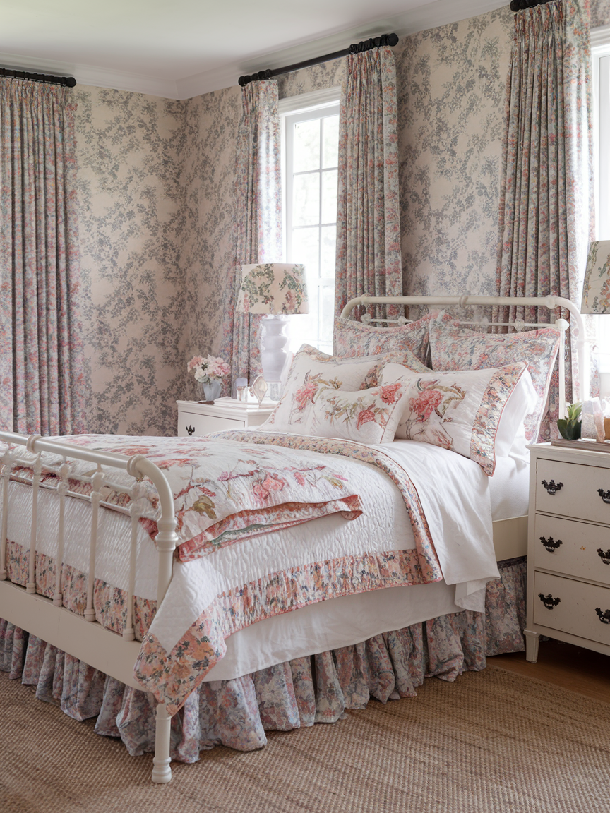 Florals are practically shabby chic’s love language. They add softness, charm, and a touch of whimsy. Curtains with faded rose prints, floral quilts, or even wallpaper with delicate blossoms create a romantic feel. The fun part is mixing and matching different floral patterns—it doesn’t need to be perfect. A small rose pattern on the curtains paired with big blossoms on throw pillows looks charming rather than chaotic. The key is sticking to muted, pastel colors so everything blends together in harmony.