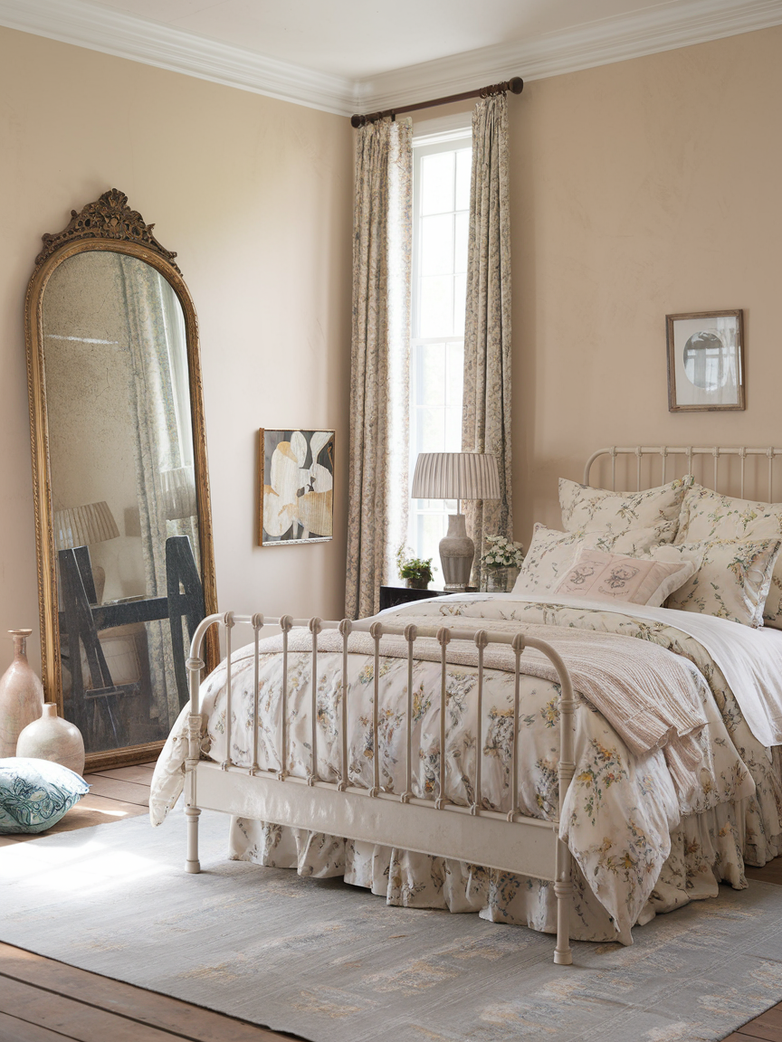 Shabby chic isn’t all about pastels and distressed finishes, it also loves a little sparkle. Subtle gold accents, like a gilded mirror, vintage candlesticks, or a small tray, add just enough glamour to keep things interesting. The trick is subtlety—you want a soft glow, not a blinding shine. Gold accents work beautifully with whites and pastels, giving your bedroom that extra touch of elegance without feeling over the top.