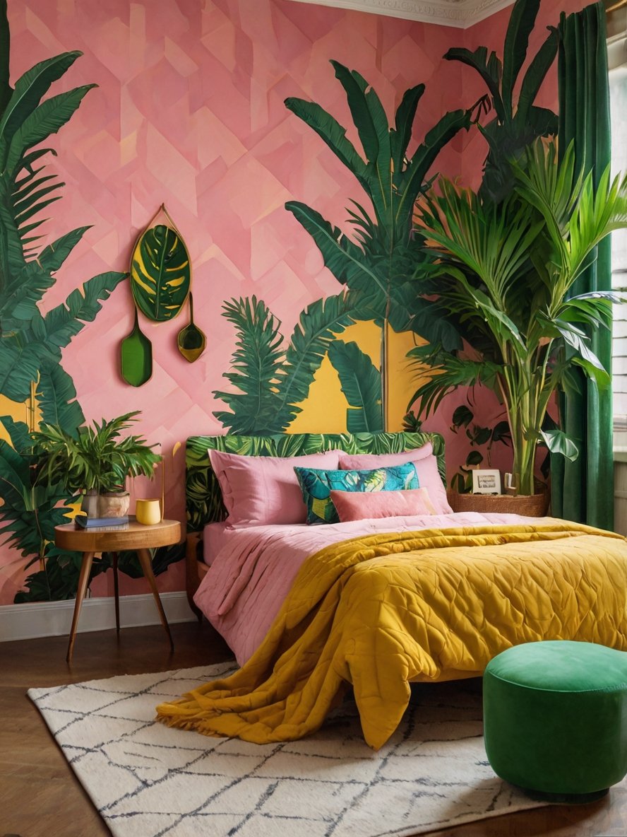 The vibrant pink wall mural adorned with lush green tropical foliage immediately transforms this bedroom into a jungle retreat. The large banana leaf and palm motifs dominate the wall, creating a lively and energizing focal point. The contrast of the bold green leaves against the soft pink backdrop strikes the perfect balance between playful and soothing. This mural not only acts as artwork but also introduces a sense of escapism, making the space feel like a tropical getaway. Its scale adds depth and drama, proving how impactful a bold wallpaper or mural can be in a dopamine design concept.