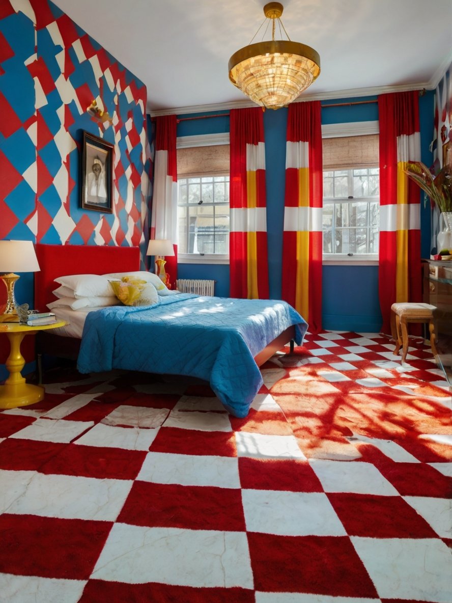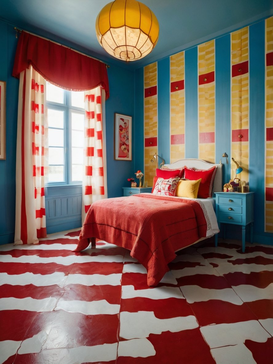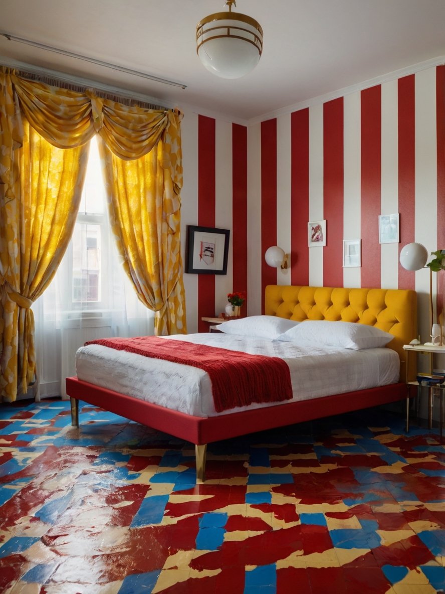 The striped curtains, featuring bold bands of red, yellow, and white, add an extra layer of vibrancy to the room. These curtains not only complement the colors in the wall and flooring but also introduce verticality to the space. The vertical stripes draw the eye upward, creating an illusion of taller windows and higher ceilings, which makes the room feel larger and more open. The rich hues of the curtains are intensified by the natural light streaming through the windows, making the colors appear even more radiant. Their placement flanking the windows adds symmetry and a sense of balance to the room, helping to offset the busy wall and floor patterns. The curtains are a perfect example of functional decor that doesn’t sacrifice style or personality.