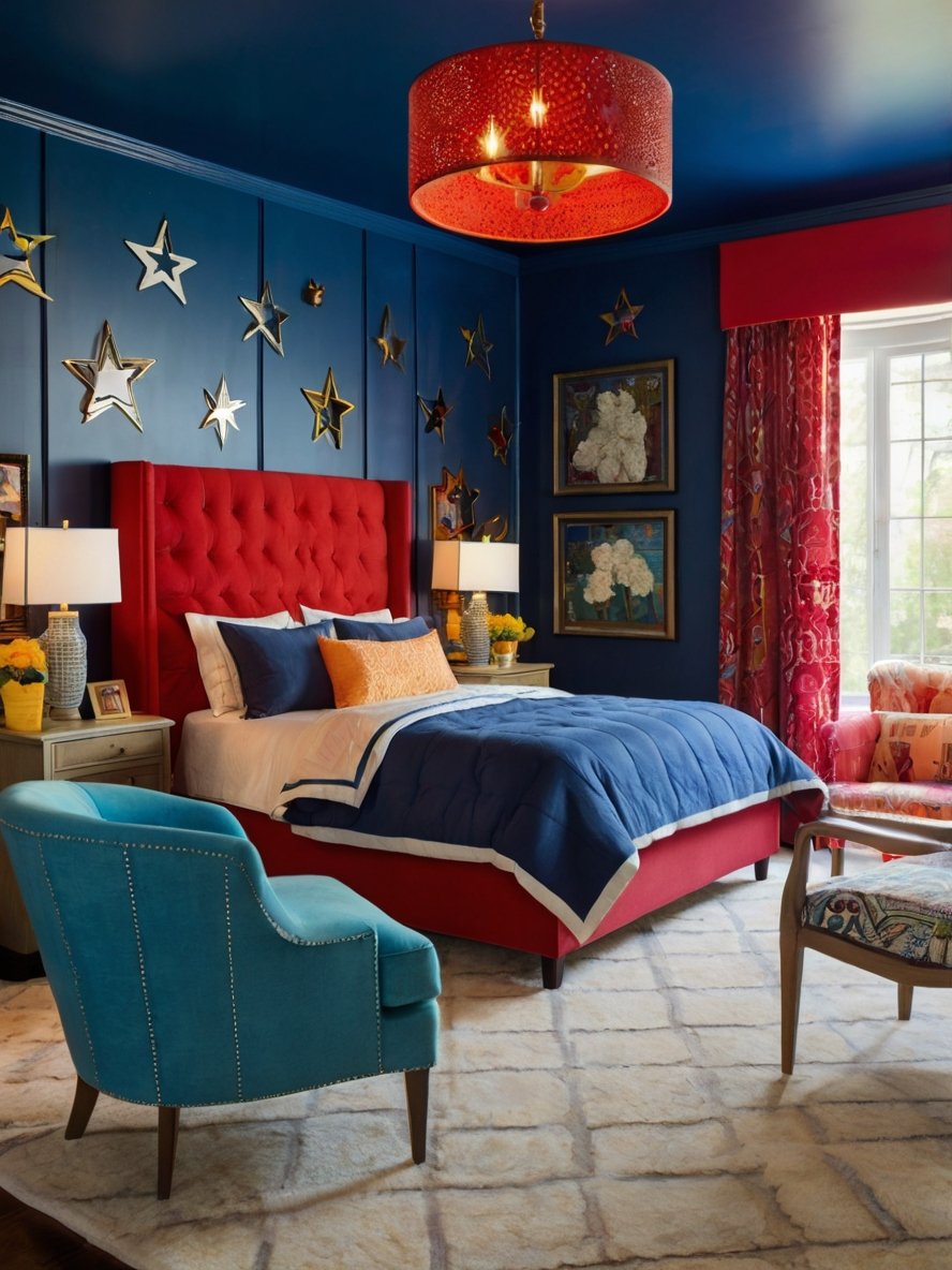 The use of contrasting bold colors, such as deep navy blue walls and ceilings paired with a bright red upholstered bed frame, creates an electrifying atmosphere. The rich navy provides a calming foundation, while the vibrant red injects energy and confidence into the space. This balance of dark and bright tones adds depth and dimension, drawing the eye to different areas of the room. The choice to integrate complementary colors exemplifies the dopamine bedroom concept, stimulating the senses without feeling chaotic. This bold color-blocking ensures the room remains vibrant yet visually cohesive.