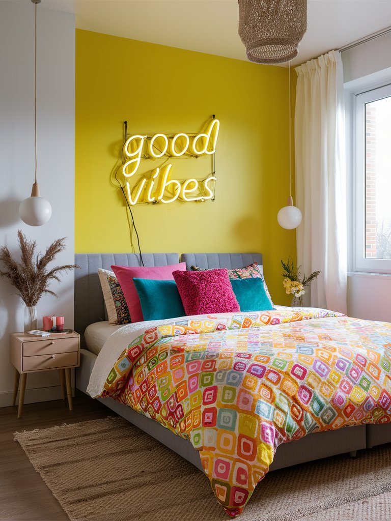 The “Good Vibes” neon wall art is the highlight of this dopamine bedroom, instantly infusing the space with positivity and warmth. Its bright yellow glow not only echoes the vibrant accent wall but also serves as a reminder of the room’s overall joyful theme. The placement above the bed draws the eye upward, creating a focal point that balances the busy patterns below. The neon light adds a modern, playful touch while breaking the monotony of traditional decor elements. Its practical function as ambient lighting also adds a warm, welcoming glow during nighttime, making the room feel cozy and uplifting simultaneously.
