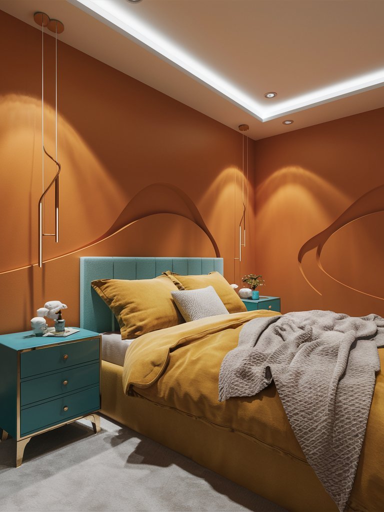 The recessed ceiling lighting provides a soft, even glow that enhances the room’s warm atmosphere. The lights create a halo effect on the walls, subtly emphasizing their texture and curves. This ambient lighting choice is ideal for a dopamine-inspired bedroom, as it avoids harsh shadows and fosters a cozy, inviting mood. The interplay between the wall-mounted pendant lights and the ceiling lights ensures the room is well-lit without feeling clinical.