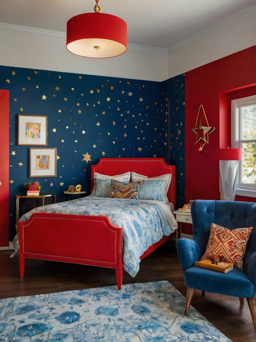 The celestial wall design in this dopamine bedroom immediately captures attention. The deep navy-blue backdrop sprinkled with shimmering gold stars evokes the feeling of lying under a clear night sky. This dramatic accent wall isn’t just visually appealing; it creates a dreamy, almost magical atmosphere that inspires relaxation and imagination. The golden stars vary in size and placement, mimicking the randomness of real constellations, which adds a touch of authenticity and whimsy. This design is perfect for creating a sense of calm while simultaneously injecting a bold, artistic flair into the room. The wall pairs beautifully with the red and blue palette, tying the celestial theme together seamlessly. It’s not just a decorative feature, it’s an immersive experience that transforms the bedroom into a serene, starlit retreat.