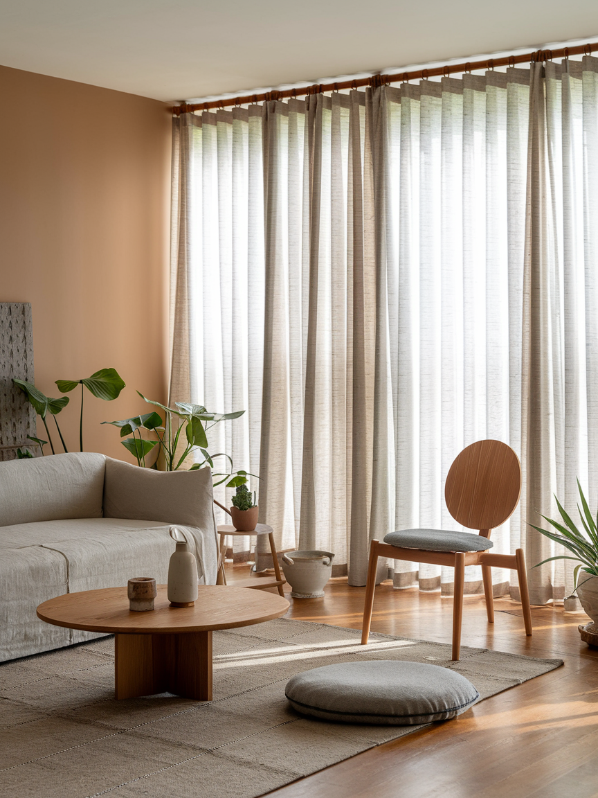 Light, neutral curtains soften the room while allowing natural light to filter through gently. Linen and cotton fabrics work particularly well, as they add texture without heaviness. Choose soft shades like off-white, sand, or light gray to maintain harmony with the overall palette. Floor-length curtains can elongate the walls and create a sense of height, enhancing the room’s openness. Their subtle movement adds a calming, almost ethereal quality that complements the serene atmosphere.
