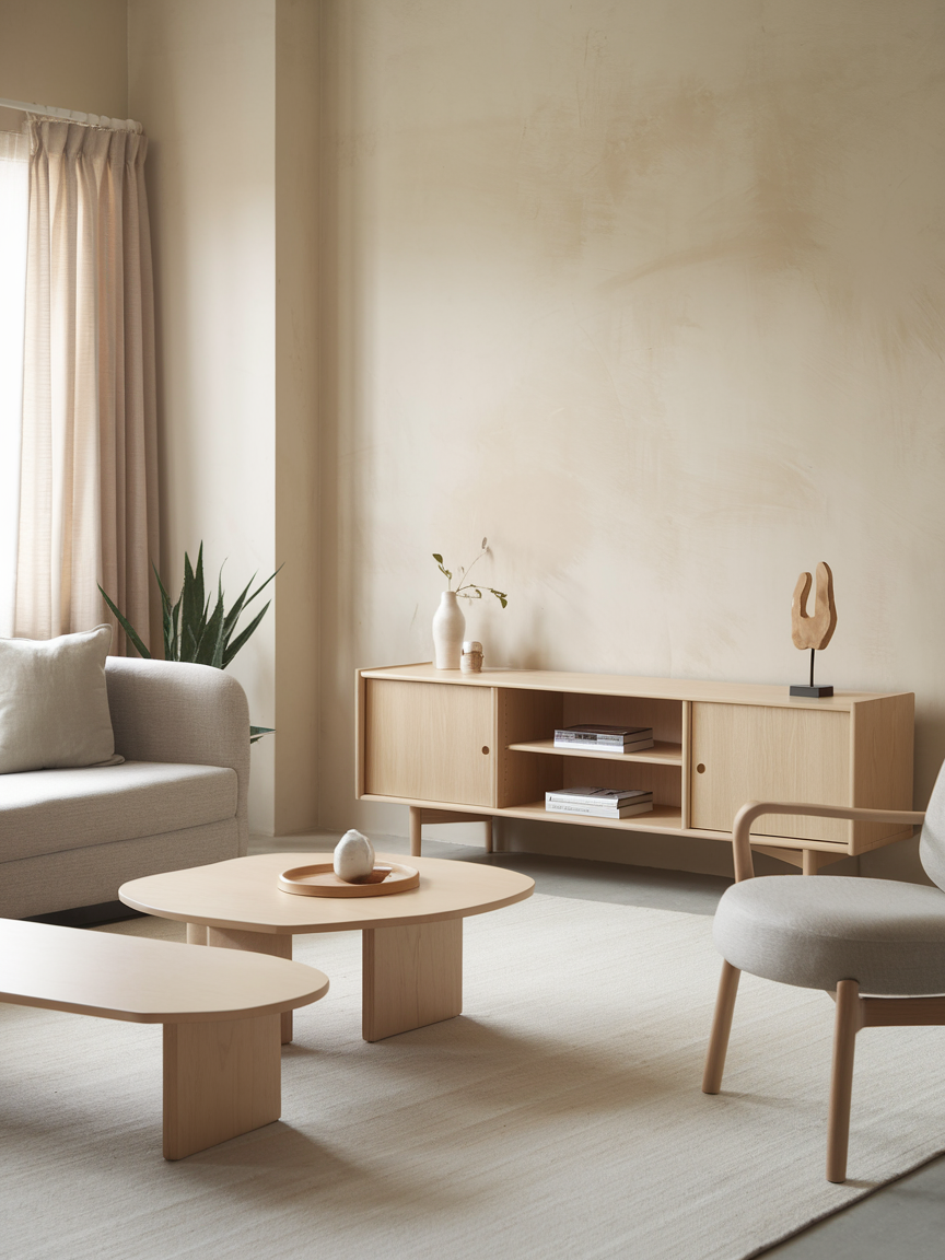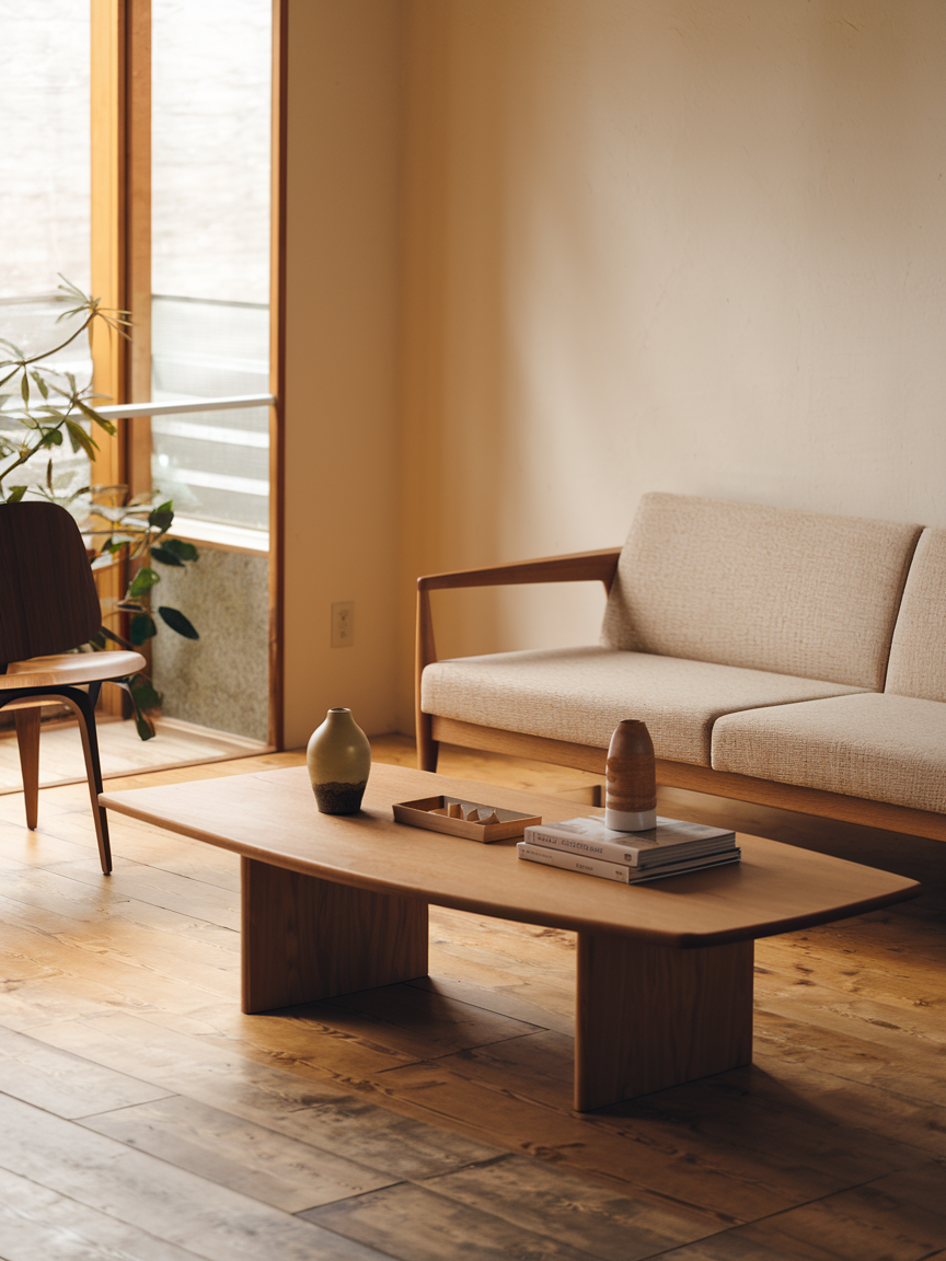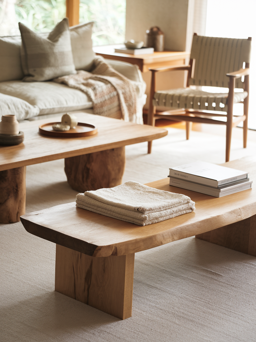 Styling a coffee table in a Japandi living room is all about restraint and intention. Instead of filling the surface, select a few meaningful items such as a ceramic vase, a small plant, or a stack of books. Arrange them with care to create balance and visual harmony. Leaving negative space is just as important as the objects themselves, allowing the table to feel light and uncluttered while still visually engaging.