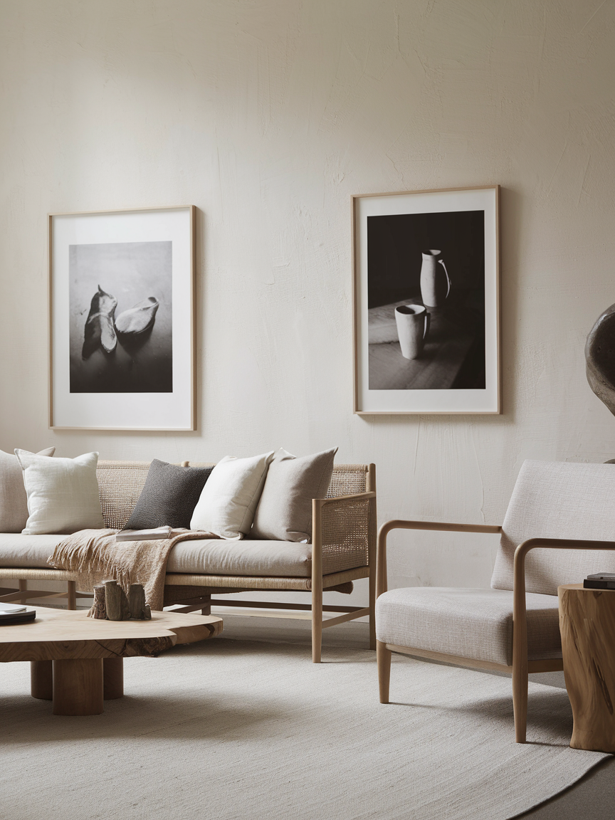 Wall art in a Japandi living room should feel calm and intentional rather than bold or overwhelming. Opt for pieces with muted tones, simple compositions, or nature-inspired themes. Black-and-white photography, abstract prints, or Japanese ink art work beautifully. Leave enough negative space around each piece so the walls can breathe. This restrained approach enhances visual harmony while still allowing personality to shine through in a subtle and refined way.
