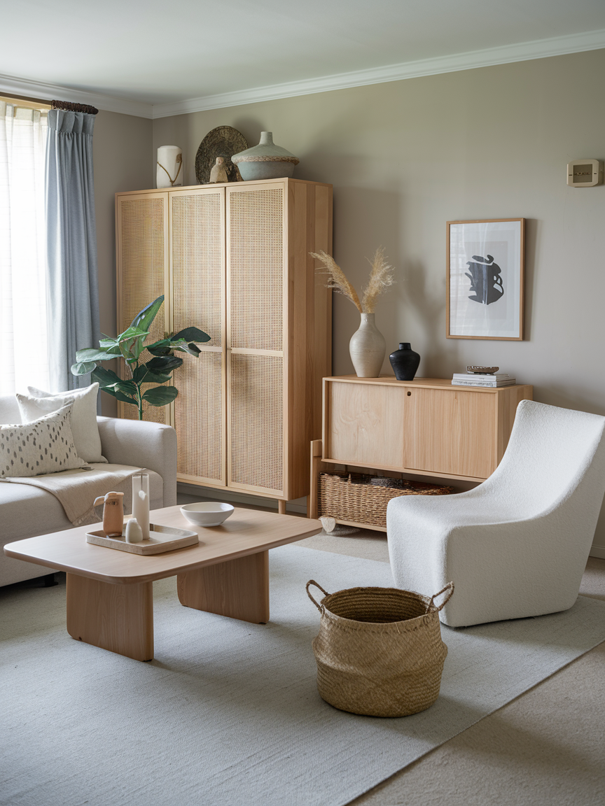 A clutter-free space is key to achieving a true Japandi aesthetic. Incorporate storage solutions that blend effortlessly with the design, such as wooden cabinets, woven baskets, or hidden compartments. Keeping everyday items out of sight maintains a clean and peaceful environment. Open storage can be used sparingly for curated decor, while closed storage keeps the room looking tidy and intentional. This balance ensures both functionality and visual calm.