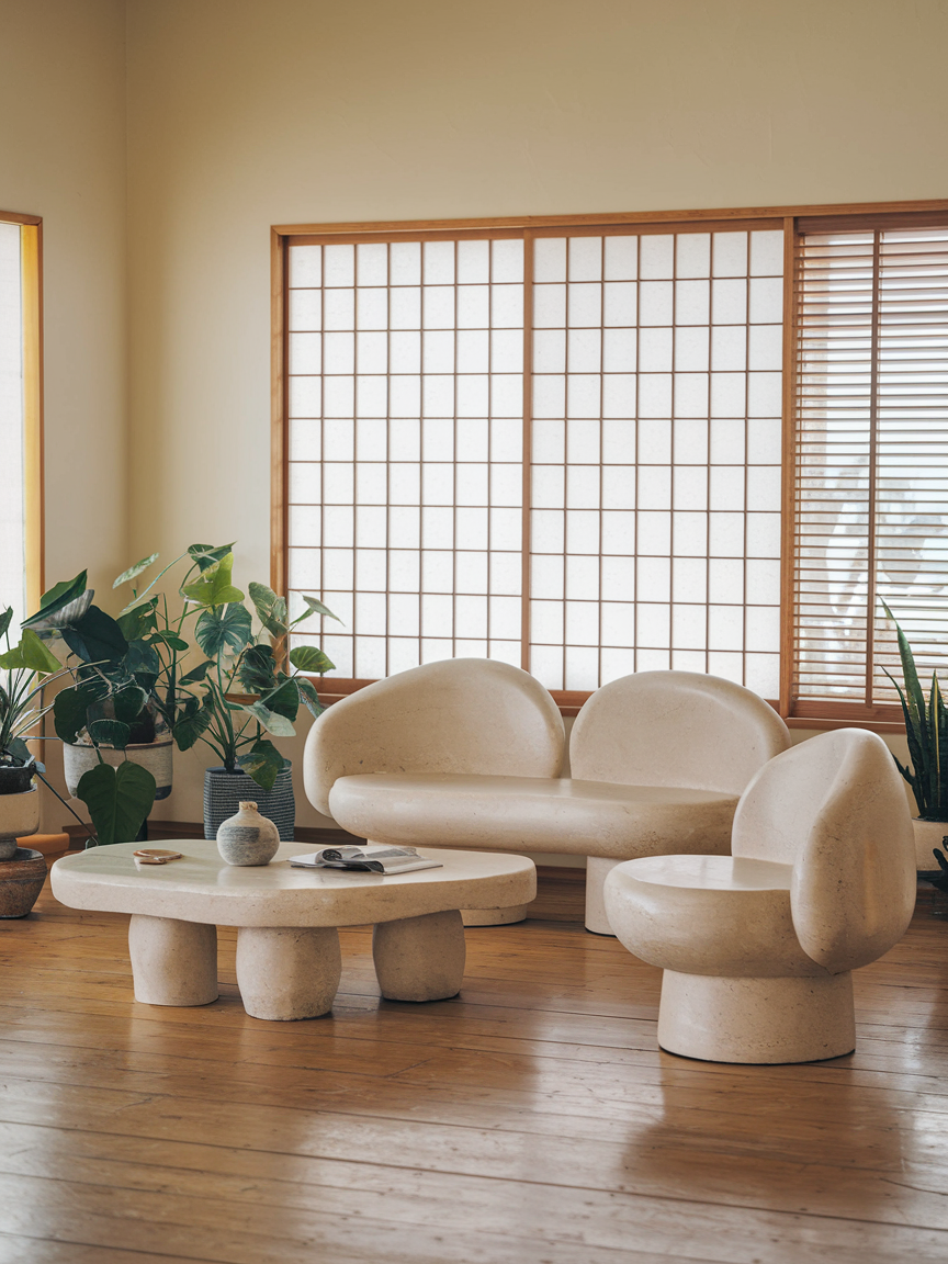 Natural stone elements introduce a sense of quiet luxury and grounding to the living room. Materials like marble, travertine, or raw stone add texture and contrast when paired with wood and textiles. Use stone in small, intentional ways, such as a coffee table, decorative bowl, or sculptural piece. These accents bring depth and sophistication while reinforcing the connection to nature that defines Japandi design, creating a space that feels both refined and serene.
