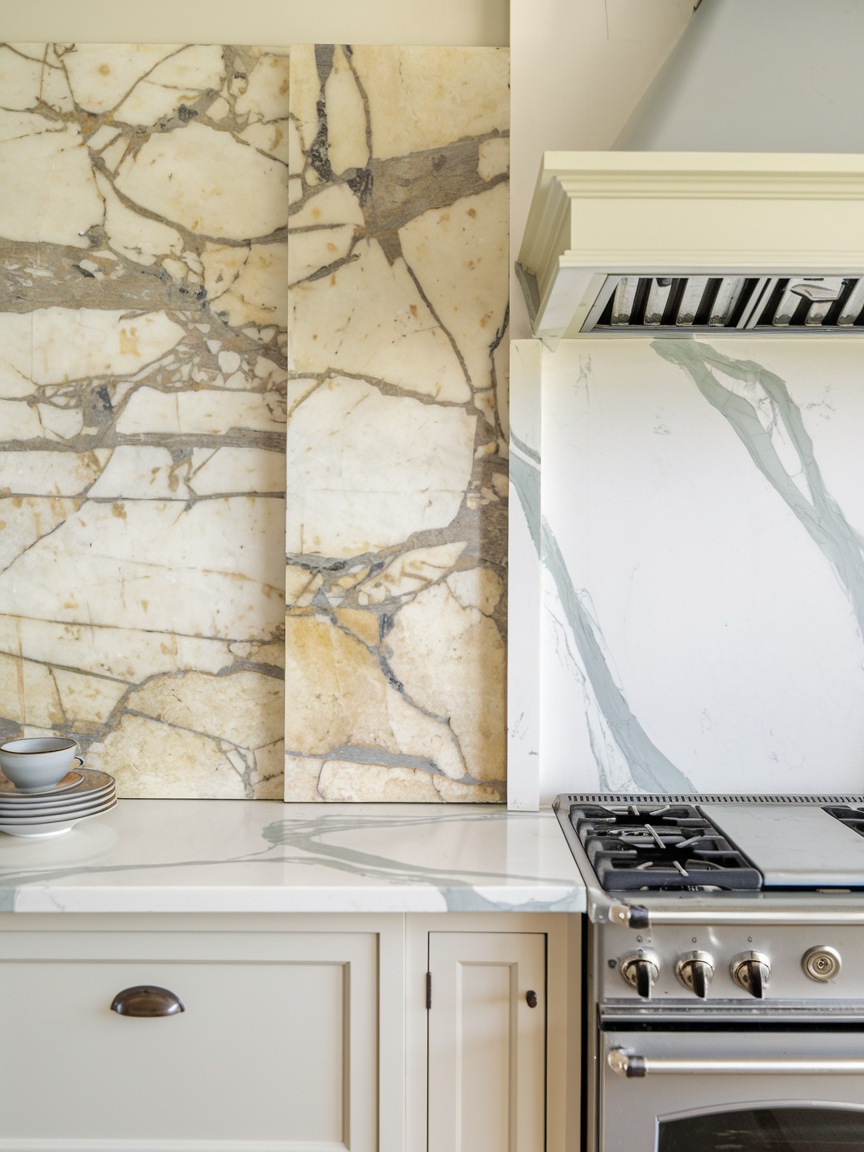 A marble slab accent wall instantly elevates your kitchen with a sense of timeless luxury and refinement. The natural veining creates organic movement and visual depth, making the wall feel like a piece of art rather than just a surface. Whether you choose classic white marble with soft gray veins or a darker, more dramatic stone, the effect is always sophisticated. Pair it with minimalist cabinetry and subtle lighting to let the material shine. Beyond aesthetics, marble reflects light beautifully, enhancing brightness and openness. This idea works especially well behind a cooktop or sink area, creating a focal point that feels both elegant and enduring.