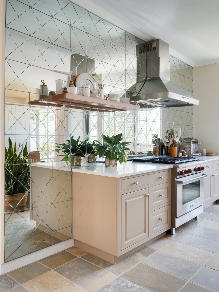 A mirrored accent wall reflects light and creates the illusion of a larger space, making it ideal for smaller kitchens. It adds a touch of glamour while enhancing brightness and openness. When used thoughtfully, mirrors can make your kitchen feel more expansive and airy. Pair with minimalist decor to avoid overwhelming the space. This design choice is both practical and stylish, offering a unique way to elevate your kitchen’s overall look.