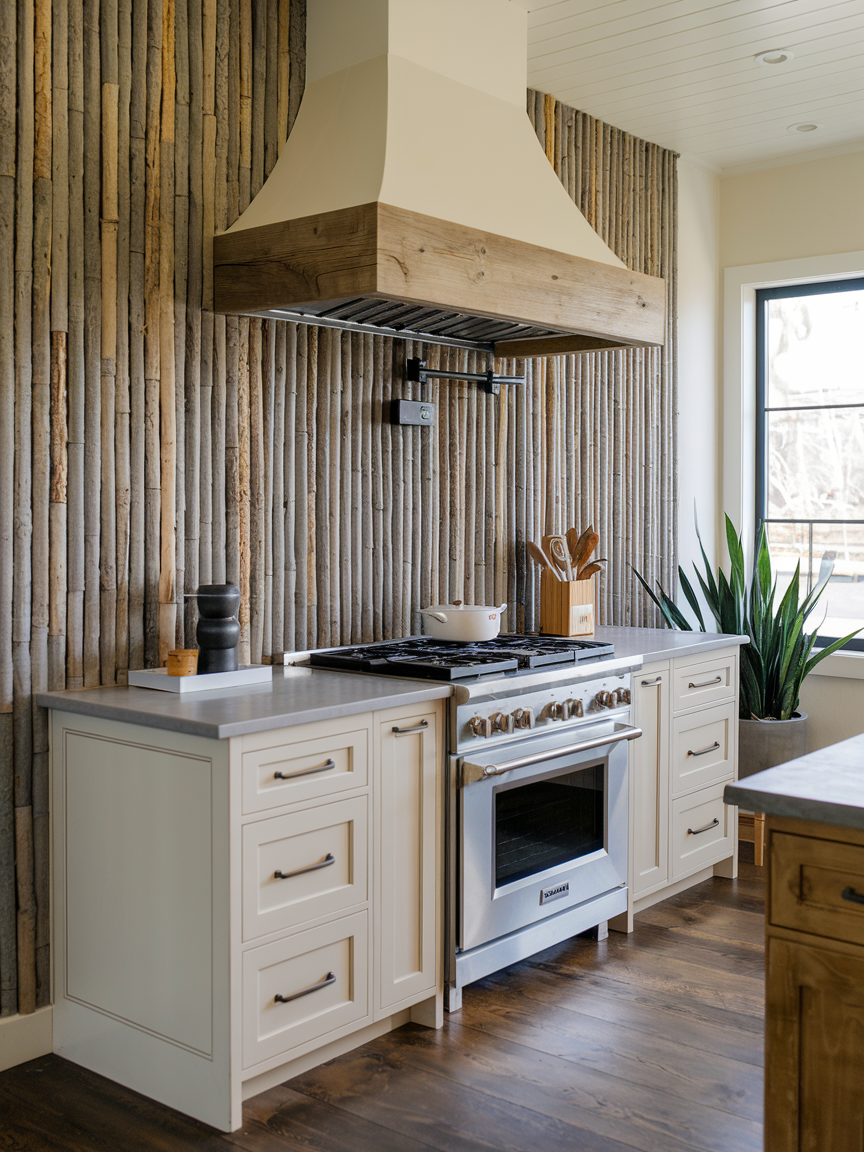 Vertical wood slats bring warmth, rhythm, and architectural interest into your kitchen. The linear design draws the eye upward, subtly making ceilings feel higher and the space more expansive. Natural wood tones soften modern kitchens and balance out sleek surfaces like stone or metal. You can choose light oak for a Scandinavian feel or deeper walnut for a richer, more dramatic look. This accent wall works beautifully behind dining nooks or breakfast bars, adding texture without overwhelming the space. It’s a perfect blend of modern design and organic warmth that makes your kitchen feel inviting and thoughtfully styled.