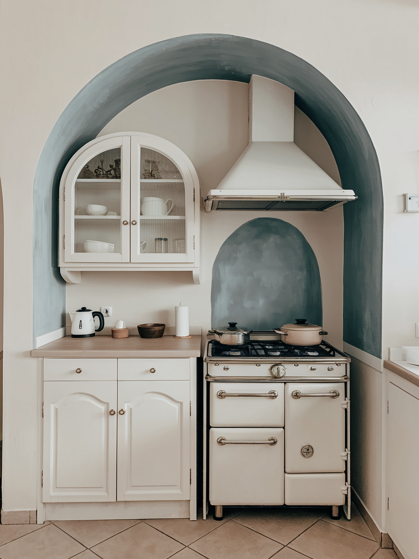 A painted arch accent wall adds a gentle, artistic touch to your kitchen without requiring major renovations. The curved shape softens the often straight lines of cabinetry and appliances, creating a more relaxed and inviting atmosphere. You can use muted tones like sage, terracotta, or dusty blue for a subtle effect, or go bold for a statement look. This design works beautifully behind open shelving, dining areas, or coffee stations. It introduces depth and personality while maintaining a clean, minimalist aesthetic, making your kitchen feel curated and unique.
