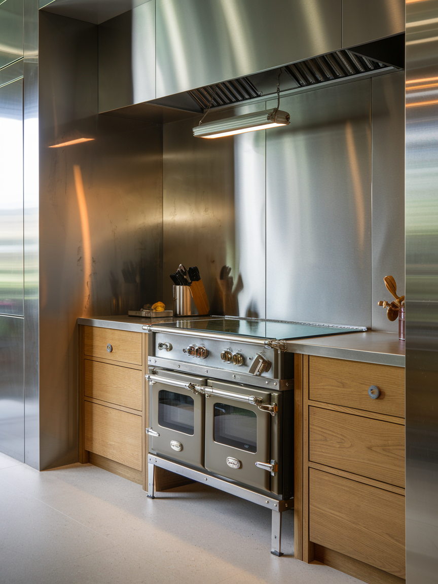 Metallic accent walls bring a sleek, contemporary vibe to your kitchen while reflecting light for a brighter, more dynamic space. Materials like stainless steel, brushed brass, or copper panels create a striking visual contrast against matte cabinetry. These surfaces are not only stylish but also practical, as they are easy to clean and maintain. Metallic walls work especially well in modern or industrial kitchens, adding a touch of sophistication and edge. When paired with warm lighting, they create a balanced look that feels both bold and refined.