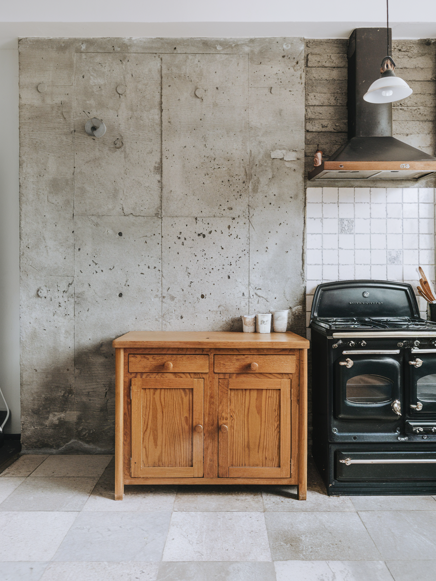 Concrete walls bring a modern, industrial edge to your kitchen. Their raw, textured appearance adds character and depth while maintaining a minimalist aesthetic. Concrete pairs well with wood, metal, and neutral tones, creating a balanced and contemporary look. It’s especially effective in urban or loft-style kitchens, where it enhances the overall design theme. Despite its rugged appearance, concrete can feel warm and inviting when combined with the right materials and lighting.