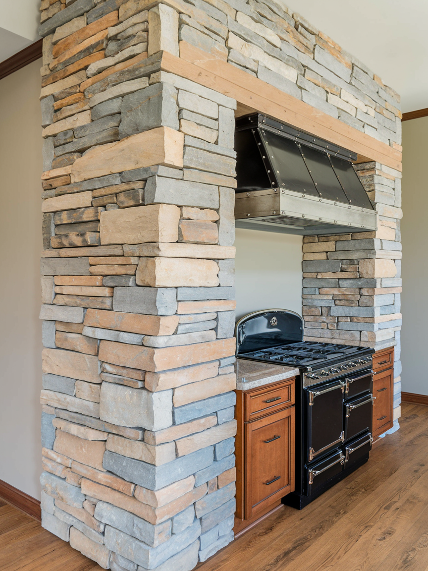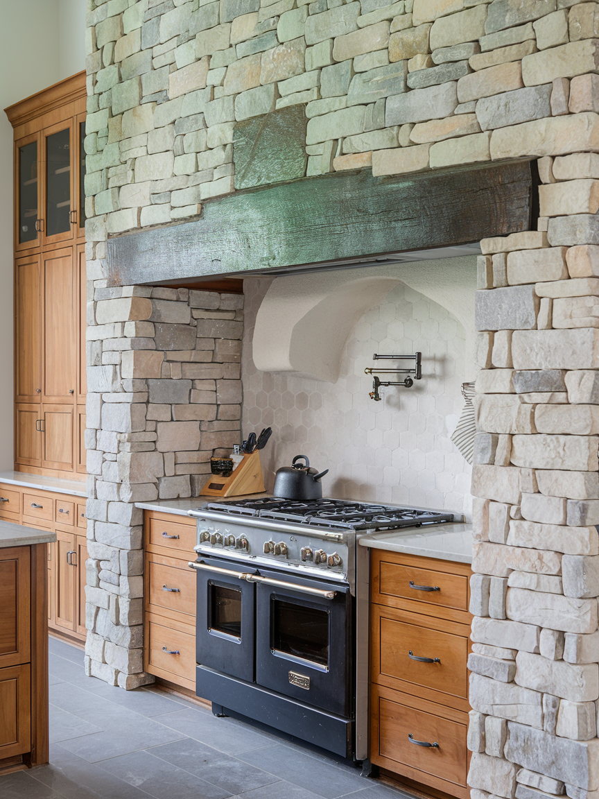 Stone veneer walls bring the beauty of natural stone into your kitchen without the weight or cost of full slabs. The textured surface adds depth and dimension, creating a warm and grounded atmosphere. Whether you choose stacked stone for a modern look or rough-cut stone for a rustic feel, this accent wall becomes a striking focal point. It pairs beautifully with wood cabinetry and neutral tones, enhancing the organic feel of the space. This design adds timeless character and makes your kitchen feel connected to nature.