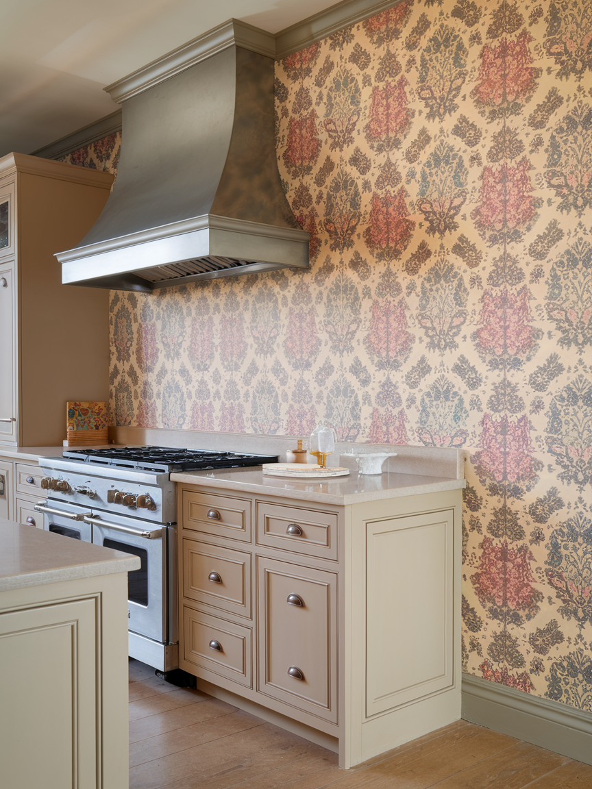 Patterned wallpaper is a fantastic way to inject personality and creativity into your kitchen without committing to permanent materials. From subtle botanical prints to bold geometric designs, wallpaper allows you to experiment with different styles and moods. Modern peel-and-stick options make it easy to update your space whenever you want a change. When used as an accent wall, wallpaper can transform a plain kitchen into a visually engaging environment. Pair it with simple cabinetry and neutral countertops to maintain balance. This approach adds charm, depth, and a sense of individuality, making your kitchen feel curated and full of life.