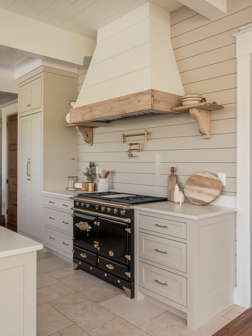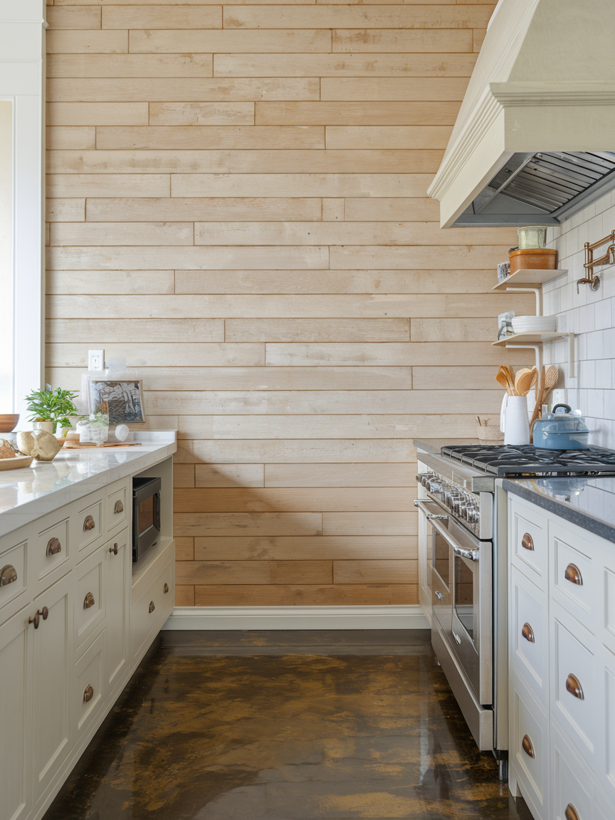 Shiplap walls bring a sense of warmth and relaxed charm that works beautifully in kitchens aiming for a cozy, inviting atmosphere. The horizontal lines add subtle texture and visual interest while keeping the overall look clean and simple. Painted in white or soft neutral tones, shiplap enhances brightness and creates an airy feel. It pairs perfectly with farmhouse, coastal, or even modern interiors when styled thoughtfully. Adding warm wood accents or vintage-inspired lighting can further enhance its appeal. A shiplap accent wall makes your kitchen feel welcoming and comfortable, turning it into a space where people naturally gather and linger.