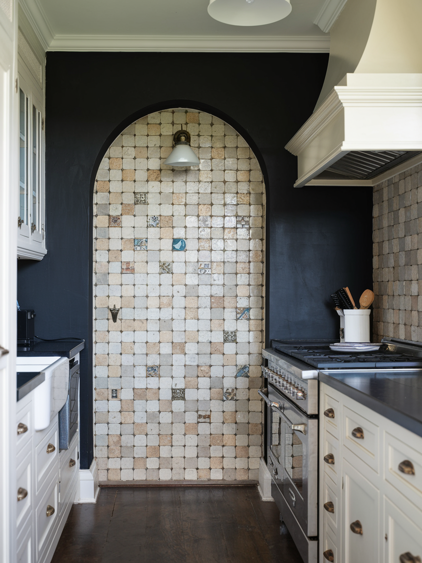 A tile mosaic feature wall transforms your kitchen into a space filled with artistry and intricate detail. Small tiles arranged in unique patterns or gradients create a visually rich surface that captures attention instantly. Whether you choose subtle neutral tones or vibrant colors, mosaics add texture and movement that make the wall feel alive. This idea works particularly well behind a stove or sink, where it can serve as both a functional backsplash and a decorative feature. Pair with minimal cabinetry to let the design shine. A mosaic accent wall adds creativity and personality, making your kitchen feel truly one-of-a-kind.