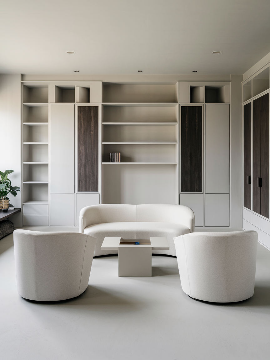 Built-in storage solutions are one of the most effective ways to maintain a clean and clutter-free minimalist living room while still meeting everyday functional needs. Custom cabinetry, recessed shelving, or wall-integrated storage units can be designed to blend seamlessly with the architecture of the space, often finished in the same neutral tones as the walls to create a cohesive and almost invisible effect. This approach allows you to store items like books, electronics, and everyday essentials out of sight, preserving the calm visual flow of the room. By eliminating bulky standalone furniture, built-ins enhance both efficiency and aesthetics, ensuring the space remains organized, polished, and effortlessly serene.