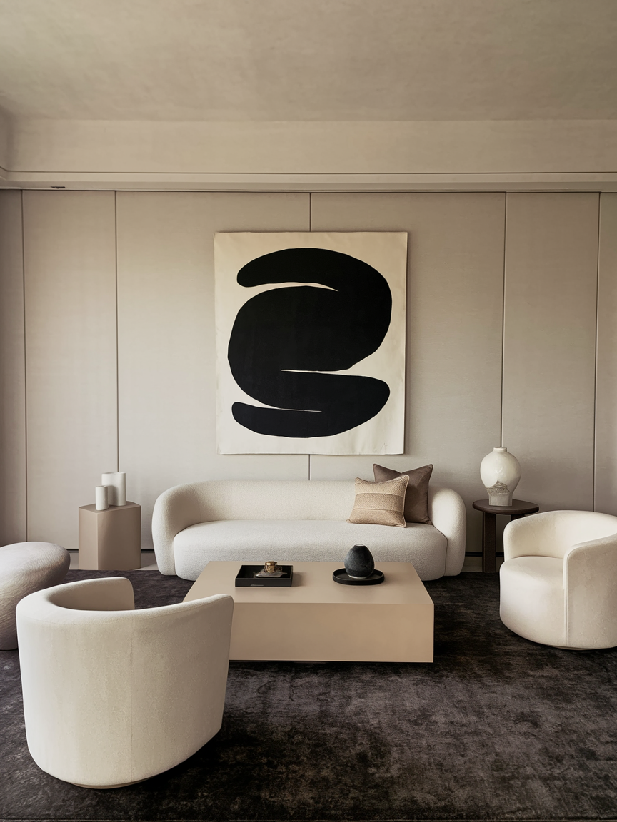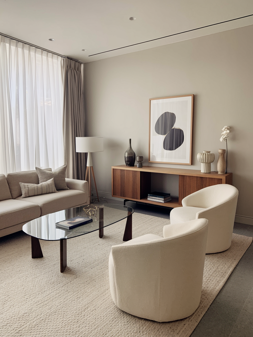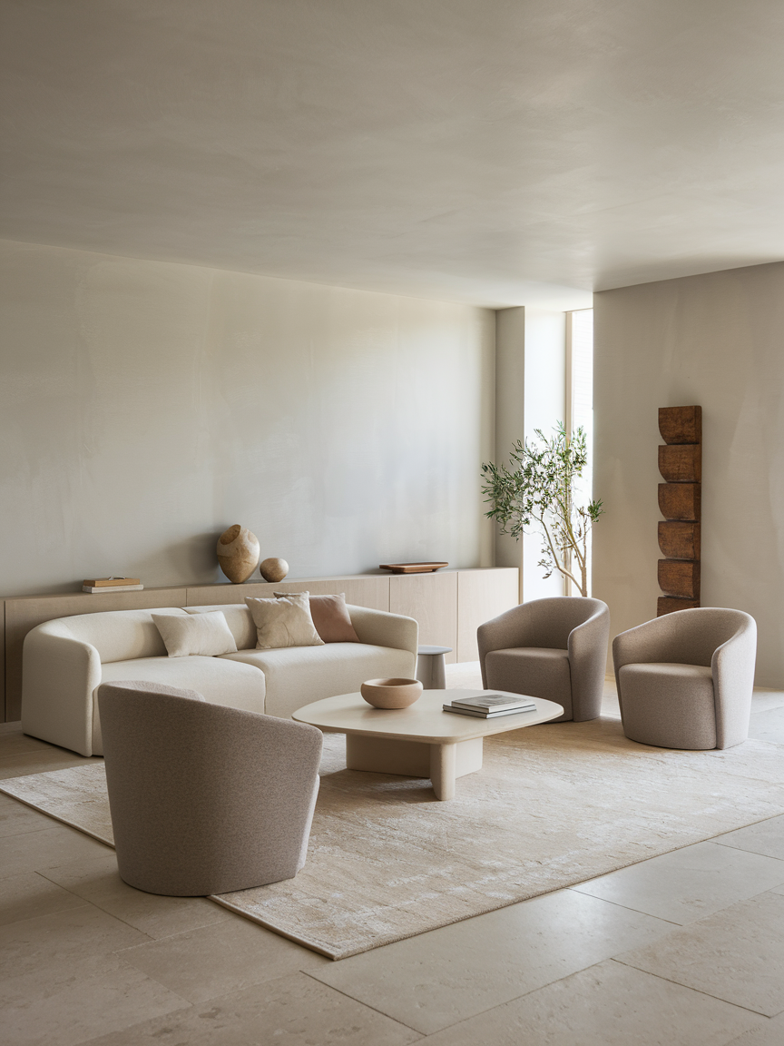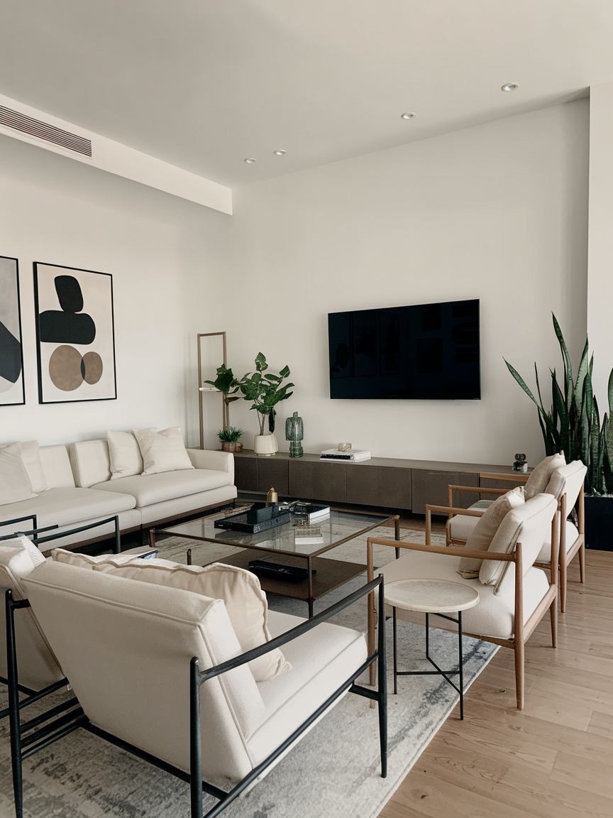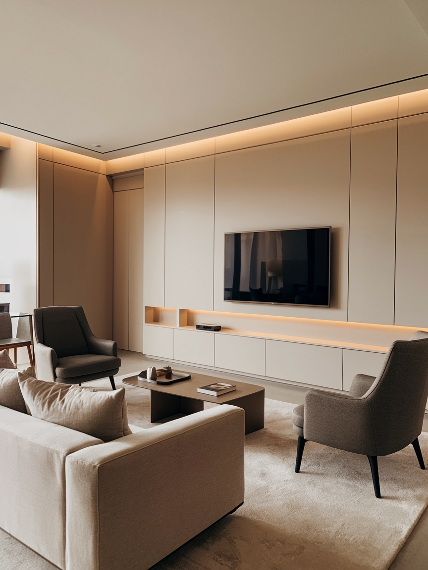 Thoughtful design plays a key role in achieving a minimalist look that still feels warm and inviting. Subtle textures, natural materials, and carefully selected furniture add depth without cluttering the space. Soft lighting and balanced proportions enhance the overall ambiance, creating a living room that feels both functional and visually harmonious.