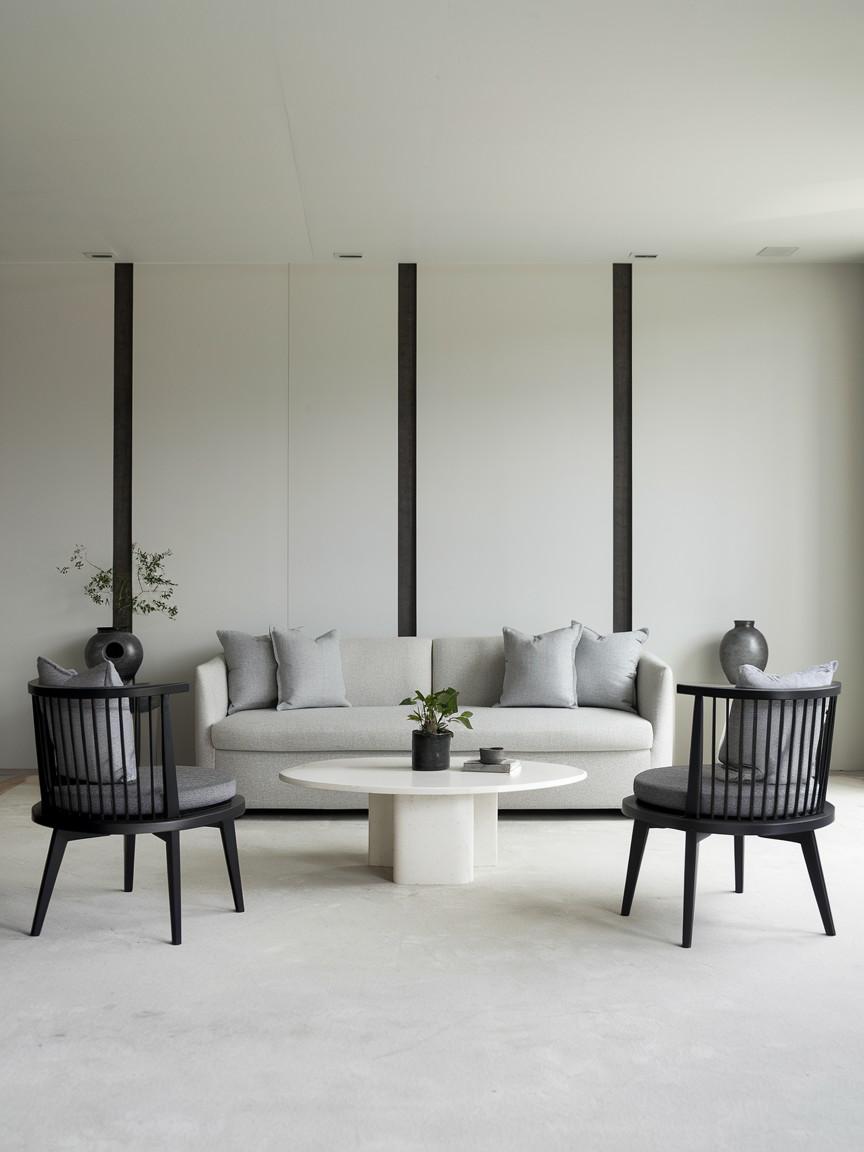 Even in a minimalist living room, a touch of contrast can elevate the entire design. Introducing dark accents such as black frames, charcoal cushions, or a deep-toned coffee table creates visual depth without overwhelming the clean aesthetic. These elements ground the space and prevent it from feeling too washed out or overly soft. The key is balance—using contrast sparingly so it enhances rather than dominates. This approach allows the room to maintain its calm, serene quality while adding a layer of sophistication and modern edge that feels intentional and refined.