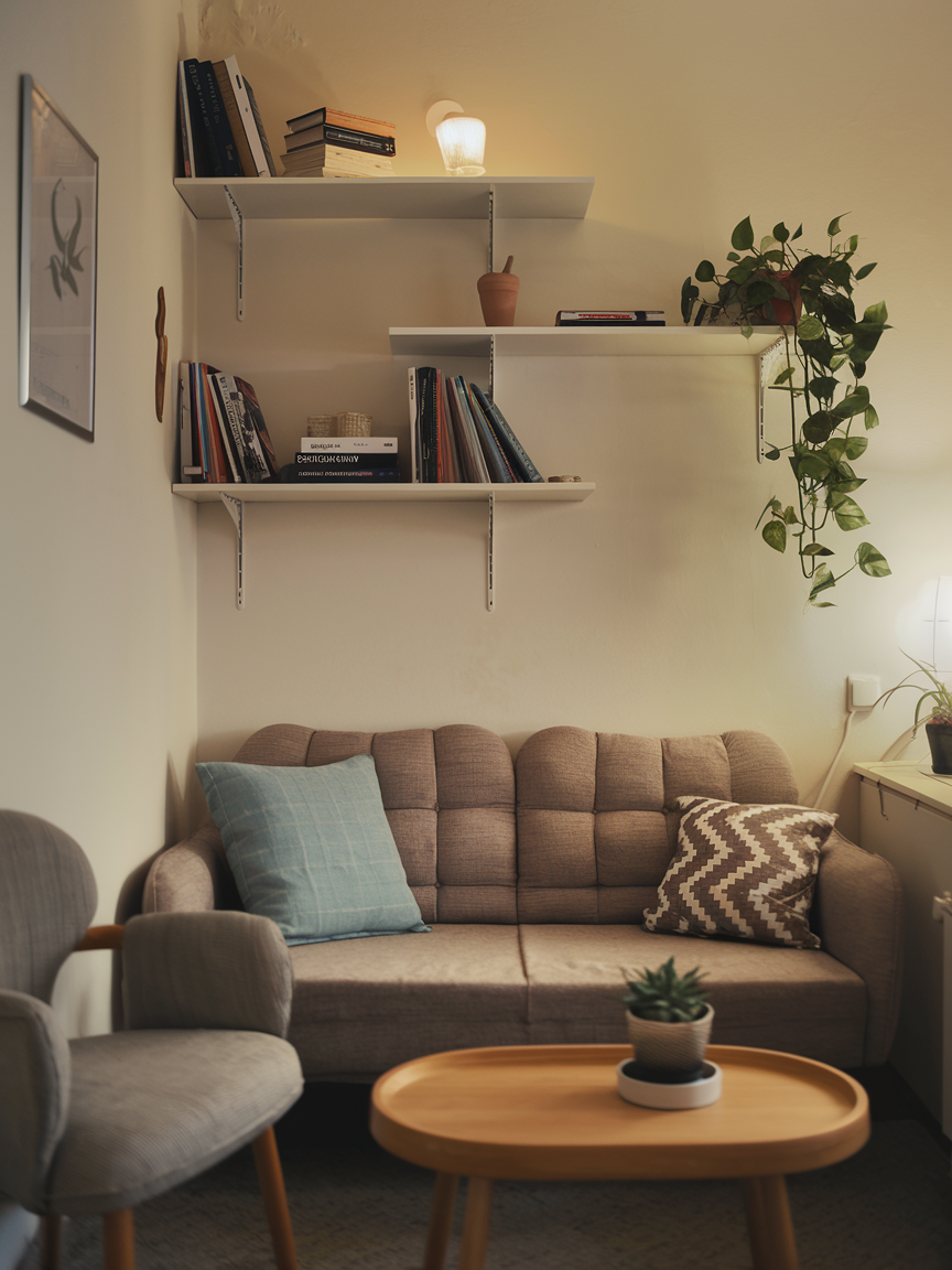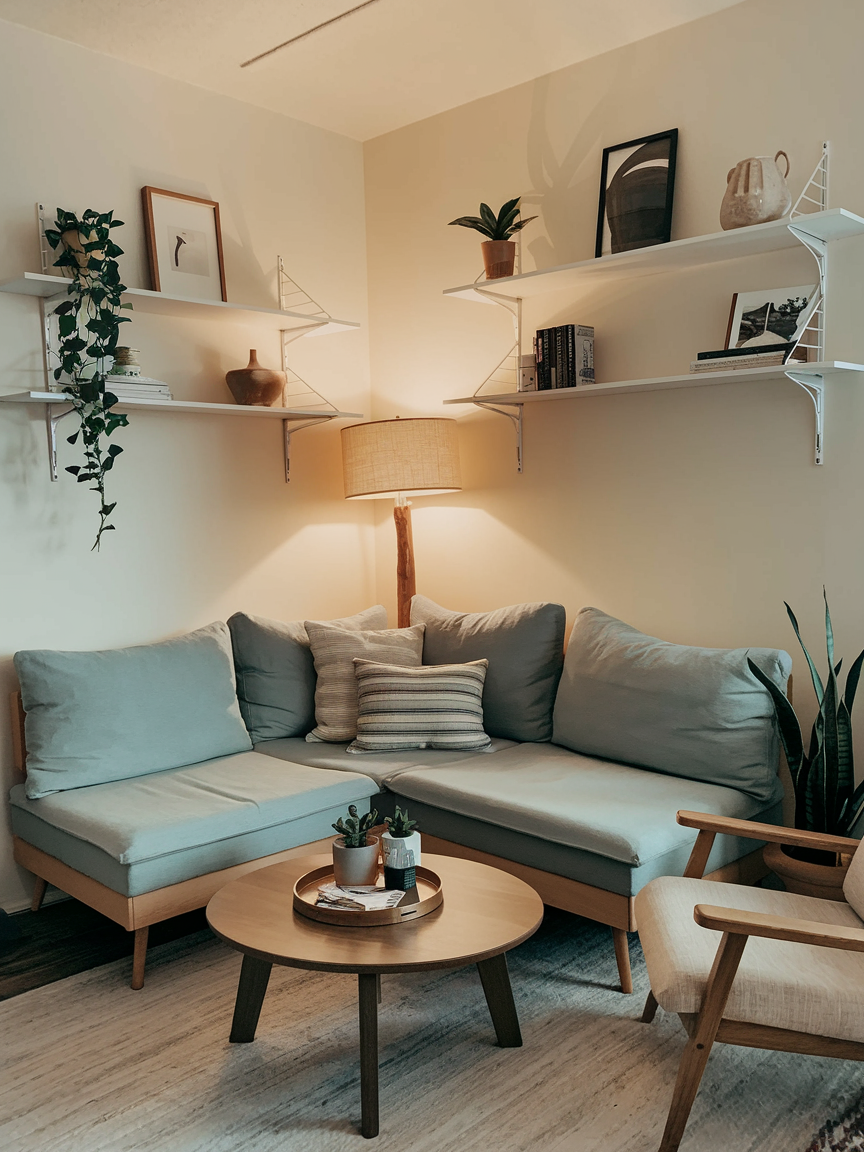 Floating shelves are both practical and stylish, giving you a place to display books, plants, and décor without taking up precious floor space. You can install them above the sofa, around door frames, or even in unused corners. I’ve used them to create a “floating” bar area in a small living room, and it looked intentional while adding valuable storage and display space.
