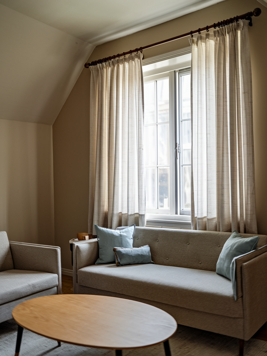 Hanging your curtains higher than the window frame can make your ceilings appear taller. Extend them all the way to the floor for maximum effect. Light, sheer fabrics let natural light flow in while still adding softness to the room. I once tried replacing heavy drapes with airy white linen curtains hung just below the ceiling, and the difference was jaw-dropping — it felt like I had gained a foot in ceiling height.