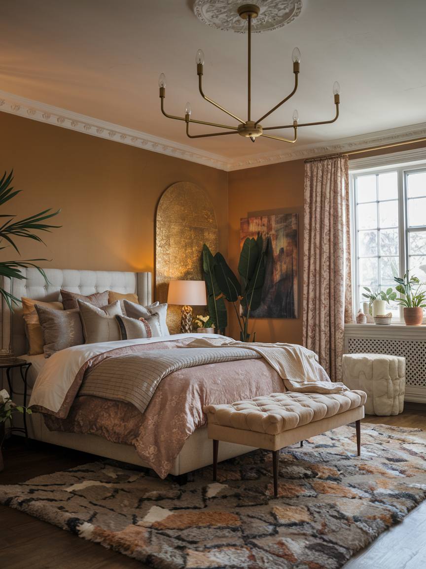 Area rugs add warmth, comfort, and visual structure to a romantic bedroom. A soft, plush rug underfoot enhances comfort while contributing to the overall coziness of the space. Layering rugs with different textures or patterns introduces depth and dimension. Rugs can help define areas within the room, such as the bed zone or seating corner, while tying together the color scheme. They are an essential element in creating a warm and inviting environment that feels both luxurious and grounded.