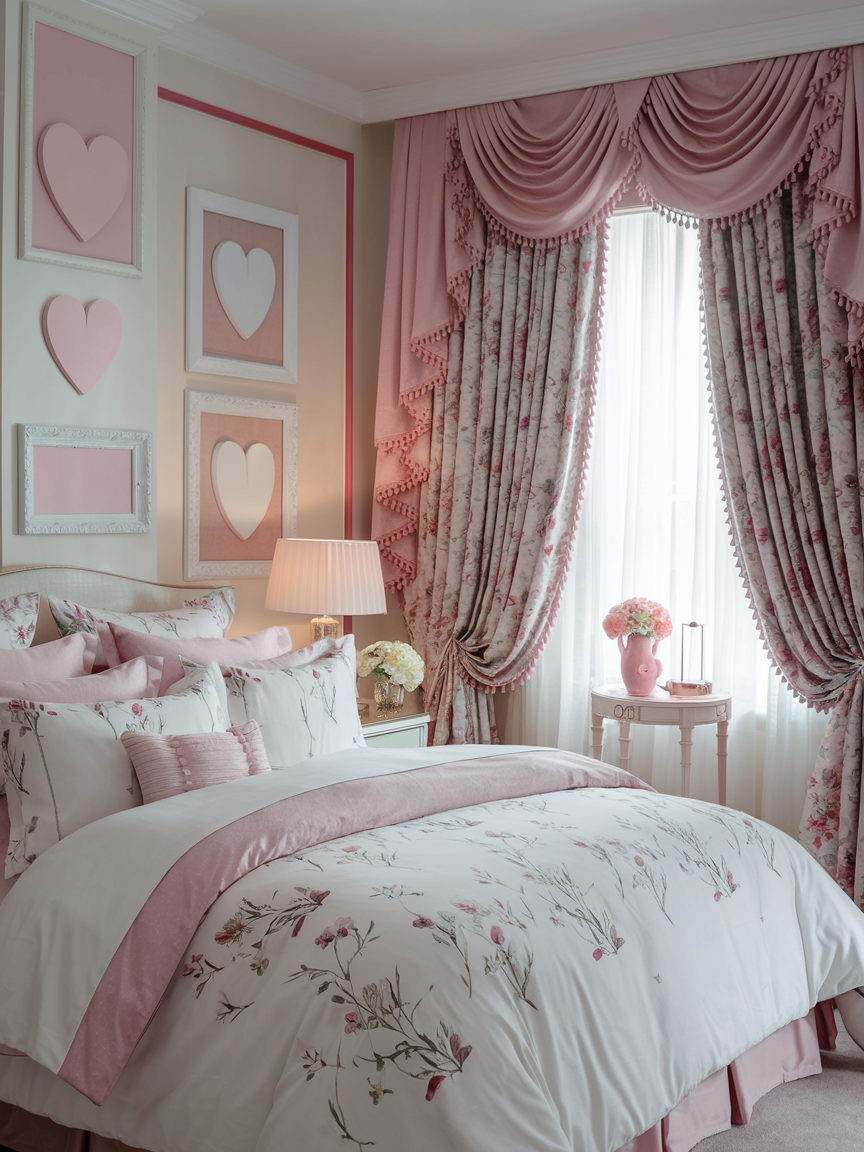 Layered window treatments add both beauty and functionality to a romantic bedroom. Sheer curtains allow natural light to filter softly into the room, creating a dreamy glow during the day, while heavier drapes provide privacy and darkness when needed. Combining both types of fabrics adds depth, texture, and visual richness. Coordinating curtain colors with bedding and furniture enhances cohesion throughout the space. Beyond aesthetics, layered curtains give you control over light and privacy, helping maintain a comfortable and intimate environment at all times.