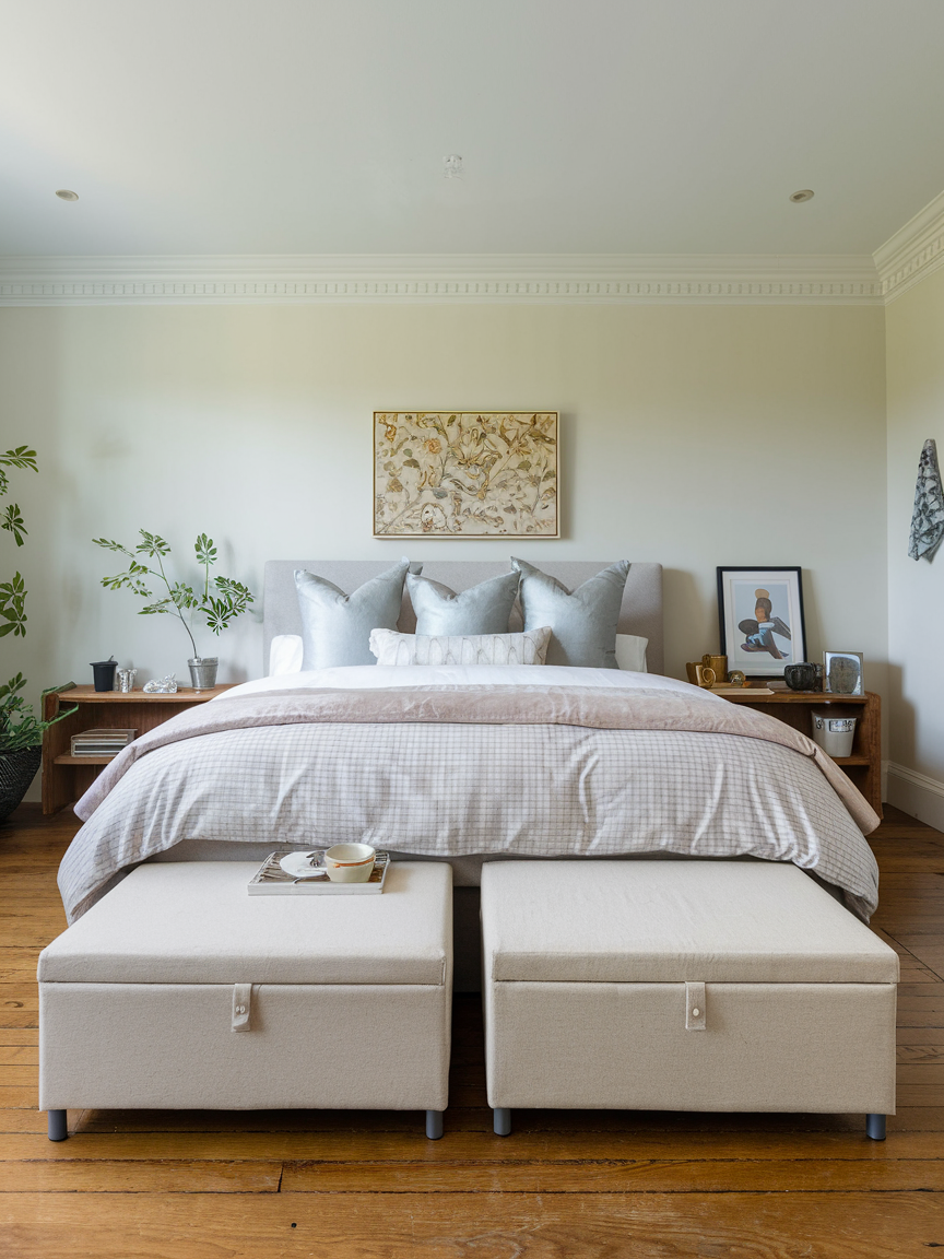 A storage bench at the foot of the bed adds both charm and practicality. It serves as a convenient place to sit while also providing hidden storage for blankets, pillows, or seasonal items. This dual-purpose piece helps keep the bedroom tidy while enhancing its overall layout. Available in a variety of materials and finishes, storage benches can complement styles ranging from rustic to contemporary. It’s a simple addition that makes the space feel more complete and thoughtfully designed.