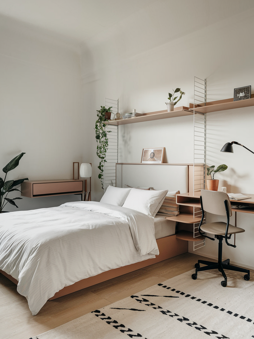 Floating desks are perfect for bedrooms that double as workspaces. Their wall-mounted design saves floor space while maintaining a clean, modern aesthetic. Paired with shelves or compact storage, they create an efficient and stylish work area. Floating desks allow the bedroom to remain open and airy while accommodating multiple functions.