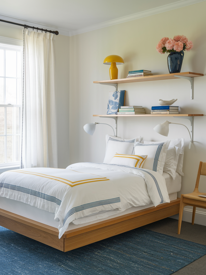 Floating shelves offer a smart and stylish way to maximize vertical space. By keeping the floor clear, they help the room feel lighter and more open—especially in smaller bedrooms. These shelves are perfect for displaying books, plants, or decorative accents, adding personality without overwhelming the space. Their versatility allows you to experiment with arrangement, whether symmetrical or layered, for a curated look. Floating shelves blend functionality with design, proving that storage can be both practical and visually appealing.