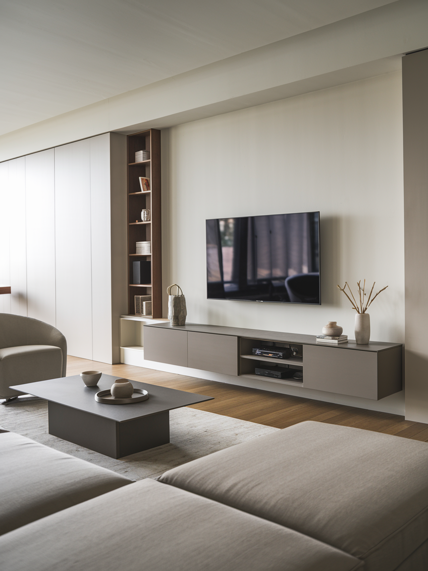 Your TV area can be a stylish focal point instead of a visual eyesore if you choose the right media console. Go for a streamlined design in wood, metal, or lacquer that fits the modern vibe of your living room. Closed storage is a lifesaver for hiding away remote controls, cables, and random clutter. For a more curated look, you can display a few books, plants, or decorative objects on top. A floating wall-mounted unit can also make the space feel lighter and more open.