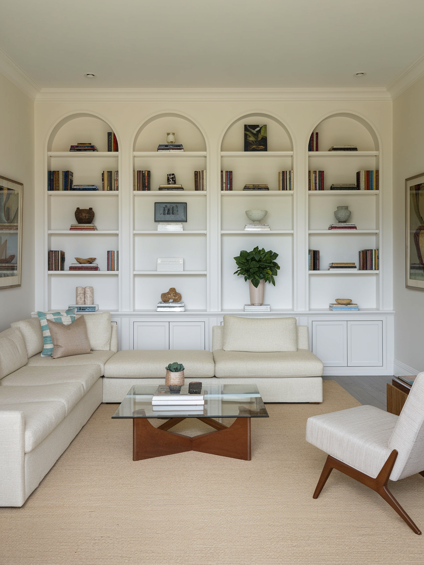 Built-in bookshelves are both practical and visually stunning. They give you space to store books, display art, and showcase personal treasures all in one place. By painting them the same color as your walls, you create a seamless, integrated look that feels custom-made. For added interest, style your shelves with a mix of vertical and horizontal book stacks, framed photos, ceramics, and plants. Built-ins also make great use of awkward wall spaces that might otherwise go to waste.