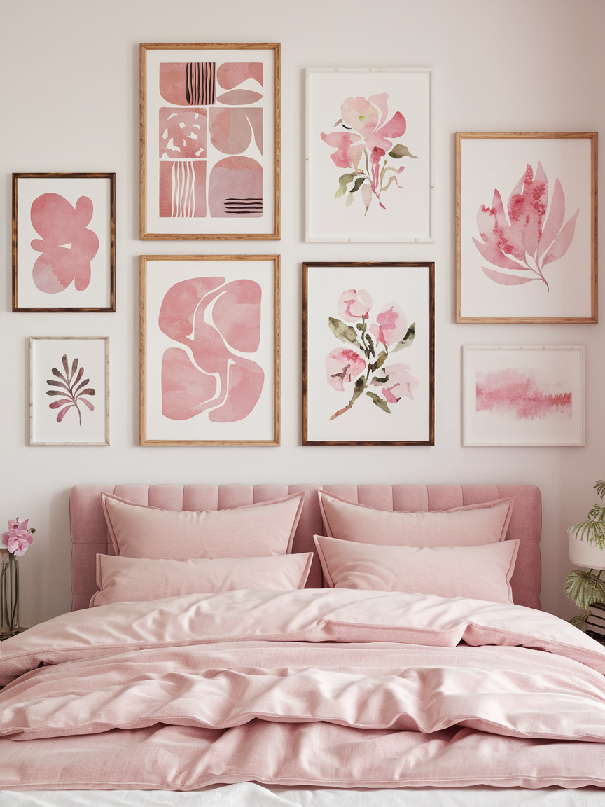 Curating a selection of pink-toned artwork adds personality and reinforces the color theme. Abstract prints, botanical illustrations, or soft watercolor pieces bring visual interest without overwhelming the space. Mixing frame finishes such as wood, white, or brass adds warmth and variety. Arranging the artwork above the bed or along a feature wall creates a focal point while maintaining a calm and elegant atmosphere.