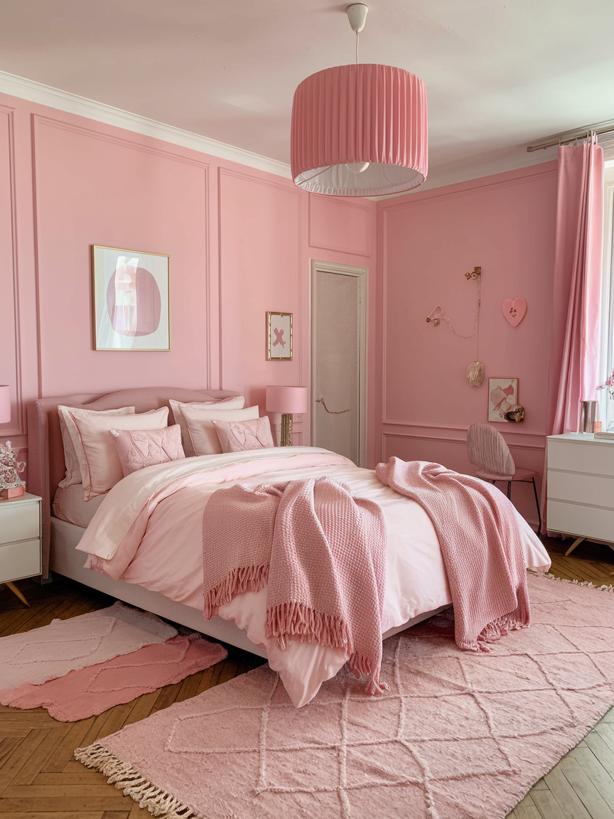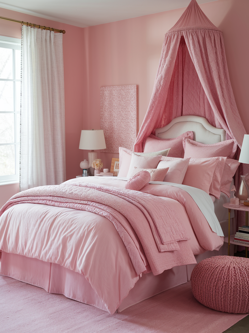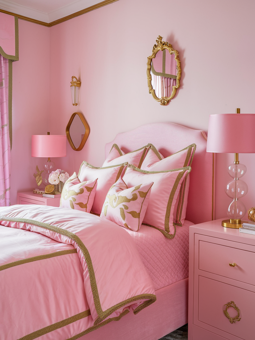Using multiple shades of pink throughout the room prevents the design from feeling flat or overly coordinated. Combining light blush, warm rose, and deeper mauve tones adds depth and visual interest. Distributing these shades across bedding, decor, and accessories creates a cohesive yet dynamic look. Keeping undertones consistent ensures harmony while allowing the color palette to feel rich and layered. This technique helps the room feel thoughtfully designed and visually balanced.