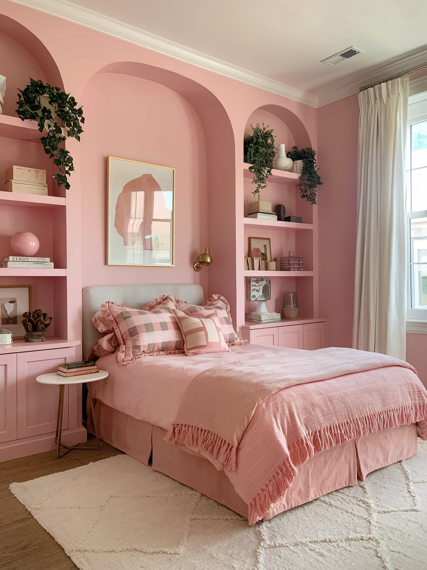 Built-in shelves painted in a soft pink tone create an elegant architectural feature that adds both storage and style. The gentle color helps decorative objects, books, and plants stand out while maintaining a cohesive palette. Styling the shelves with a mix of neutral items and natural textures keeps the look balanced and uncluttered. Pink shelving works especially well around a bed or reading nook, adding depth without overwhelming the space.