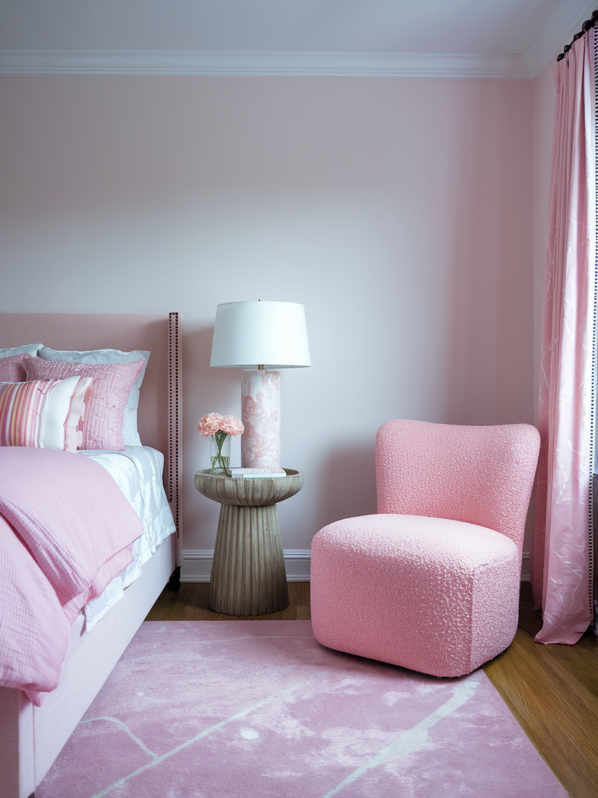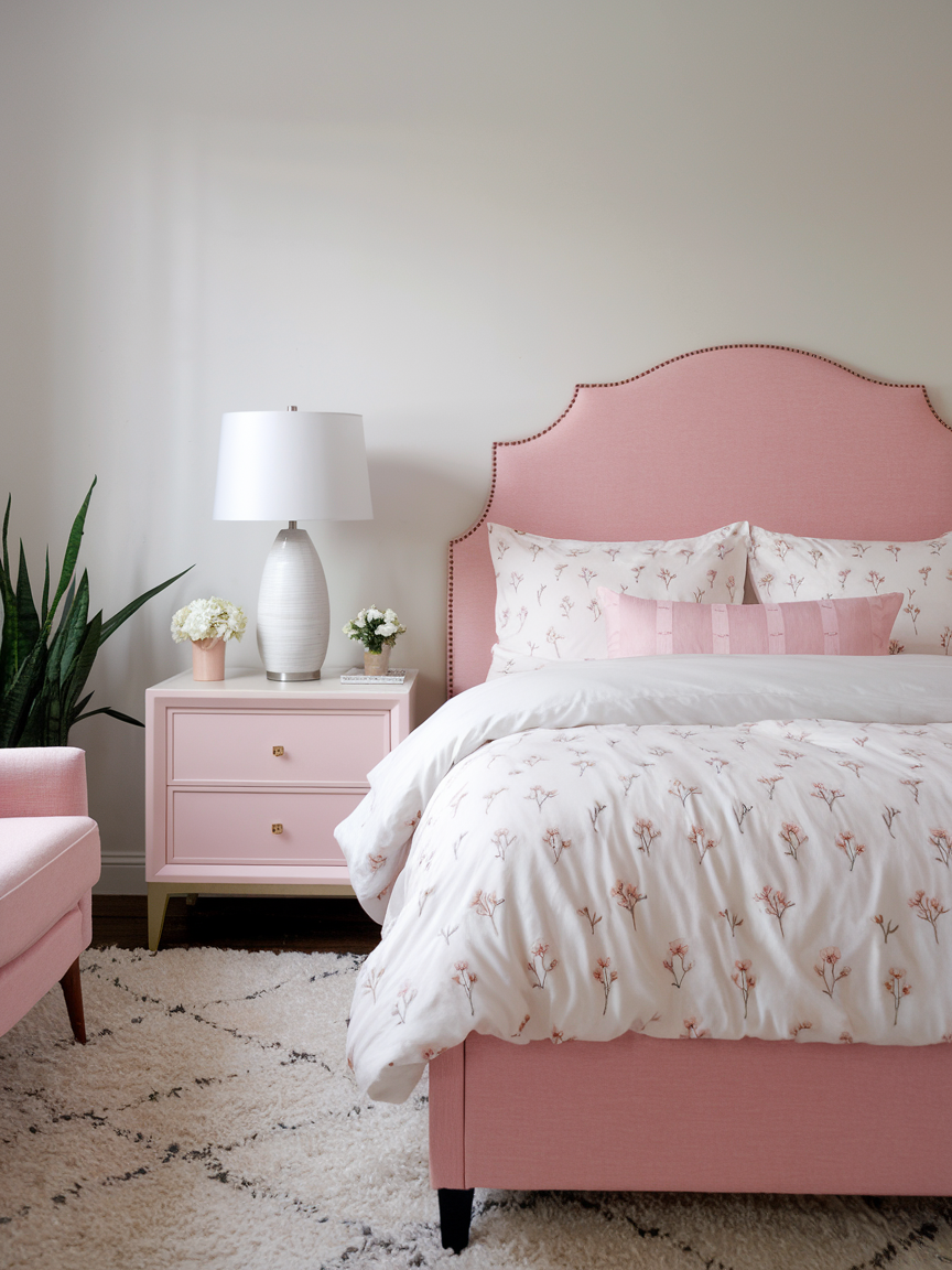 Layered bedding, cozy throws, warm lighting, and a mix of natural materials help balance the sweetness of pink for a refined and modern look. Neutral companions like white, beige, gray, or warm wood tones keep the design grounded while allowing the color to shine. Thoughtful décor elements such as artwork, decorative pillows, and subtle patterns add depth without overwhelming the room.