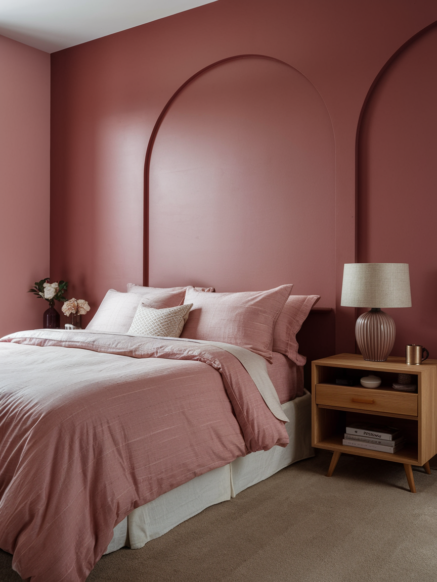 A dusty rose accent wall adds depth and character without overwhelming the entire room. This muted pink tone feels mature and refined, making it ideal for modern or transitional bedrooms. Placing the accent wall behind the bed helps create a natural focal point and enhances the overall layout. Pairing dusty rose with neutral bedding, metallic accents, or natural materials keeps the design balanced and elegant. Soft lighting enhances the richness of the color, creating a cozy and inviting environment that feels both stylish and restful.