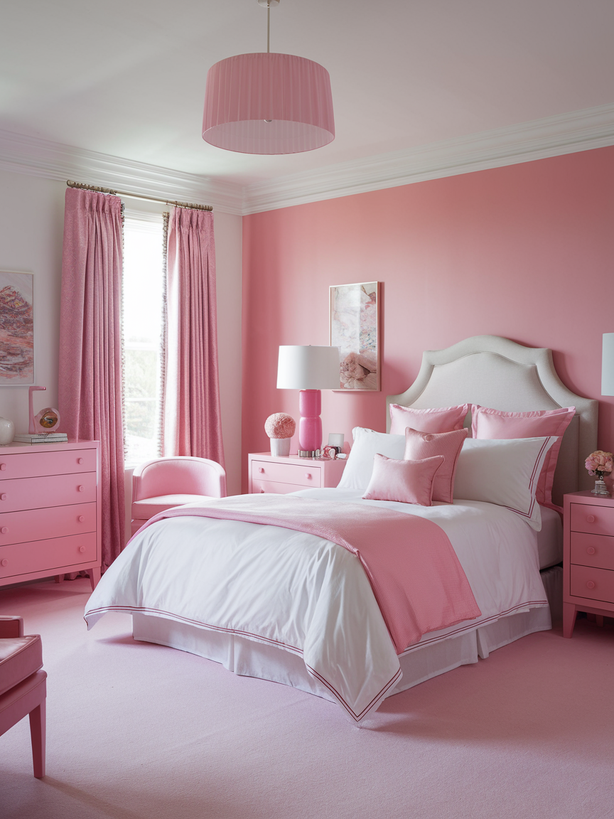 The timeless pairing of pink and white creates a fresh, bright, and elegant bedroom environment. White walls, bedding, or furniture keep the space feeling clean and airy, while pink accents add warmth and personality. Layering textures such as linen, cotton, and soft rugs prevents the design from feeling too crisp or minimal. This combination works beautifully in both modern and romantic interiors.