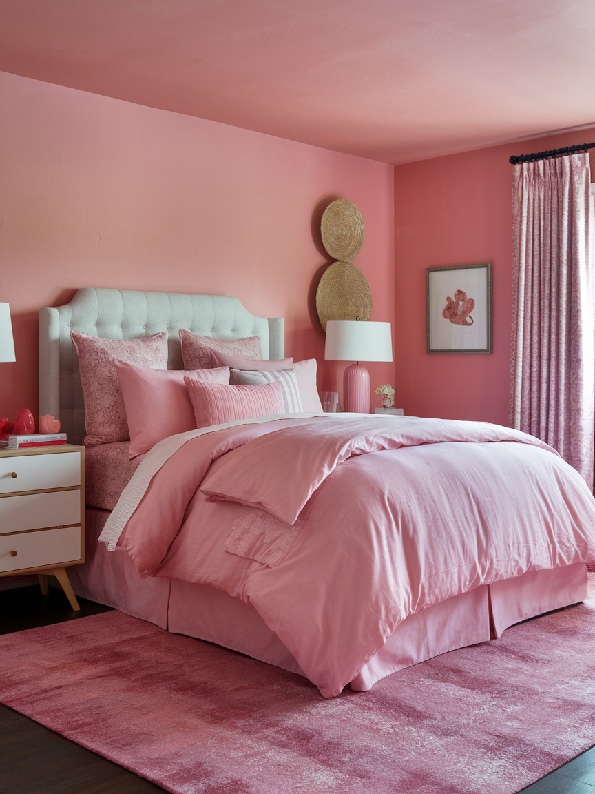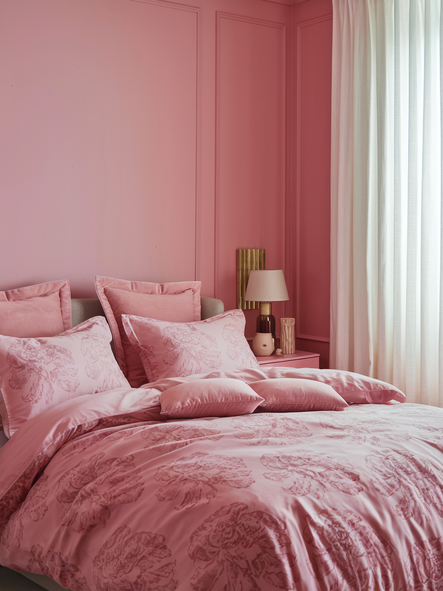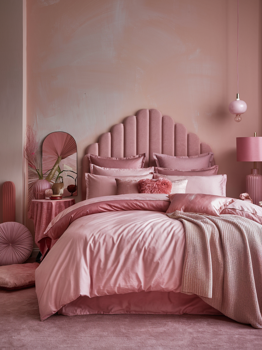 Layering different pink textiles is an easy way to create a rich and comfortable bedroom design. Mix various shades such as blush, rose, mauve, and soft coral through blankets, quilts, pillows, and curtains. Incorporating different textures like velvet, cotton, linen, and knit adds depth and visual interest without relying on bold patterns. This approach keeps the palette cohesive while making the space feel warm and inviting. The layered look also allows for seasonal updates by swapping lighter or heavier fabrics as needed. A thoughtfully layered pink bedroom feels plush, stylish, and effortlessly cozy—perfect for creating a relaxing personal retreat.