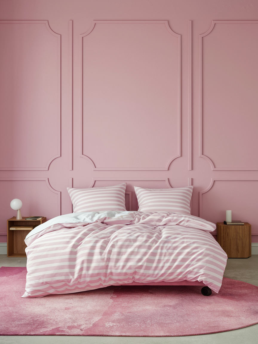 Combining pink with neutral tones such as beige, taupe, warm gray, or ivory helps create a calm and sophisticated environment. Neutral furniture and rugs prevent pink from feeling overpowering while allowing it to stand out as an accent. Natural materials like wood, rattan, or woven textiles further enhance warmth and balance. This combination works beautifully in modern and minimalist bedrooms, creating a timeless look that feels soft, inviting, and easy to update over time.